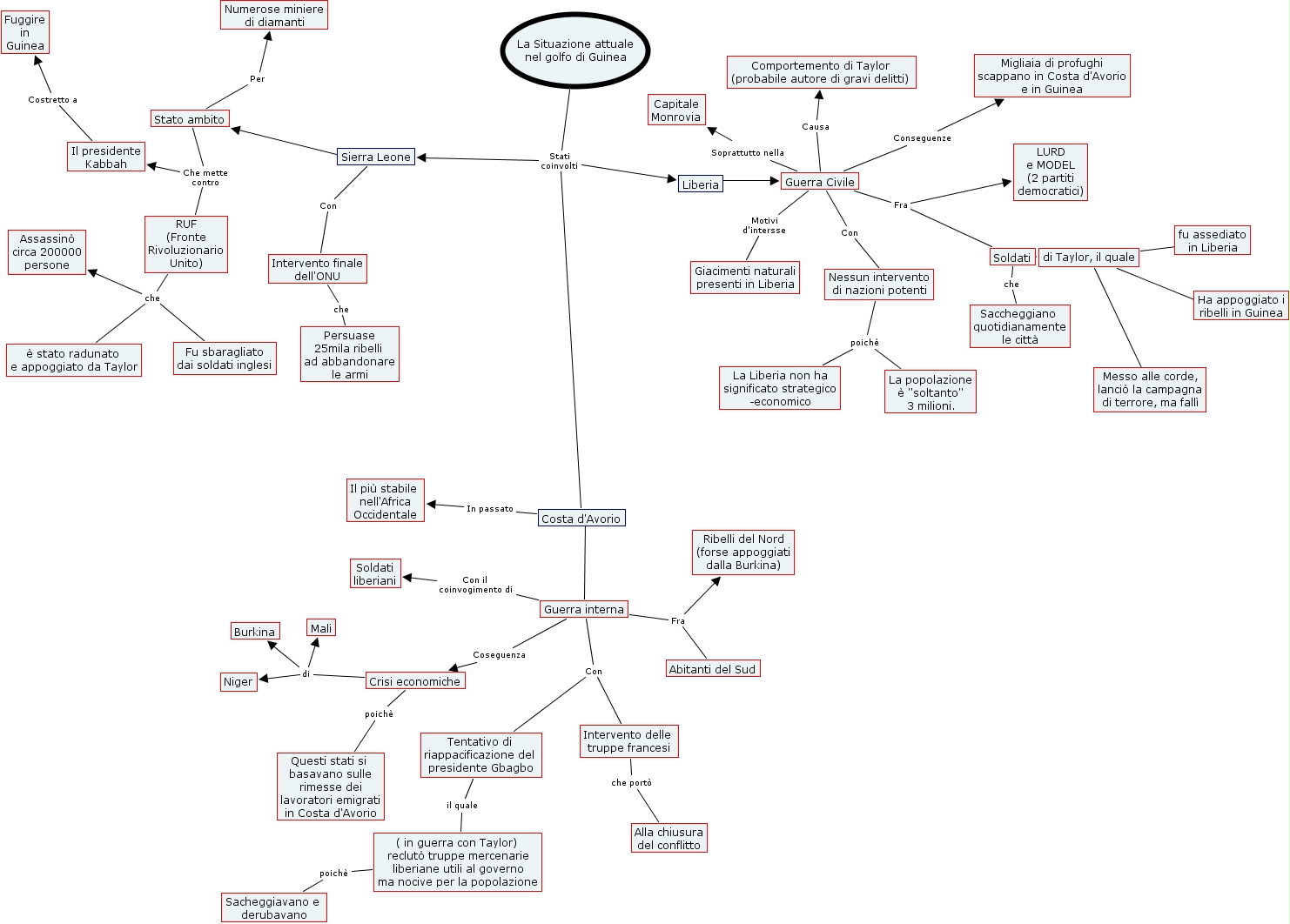 Mappa Tia Conc3, Guerra Civile Conseguenze Migliaia di profughi scappano in Costa d'Avorio e in Guinea, Soldati che Saccheggiano quotidianamente le città, di Taylor, il quale ???? fu assediato in Liberia, Crisi economiche di Burkina, Guerra Civile Motivi d'intersse Giacimenti naturali presenti in Liberia, Guerra Civile Fra Soldati, Stato ambito Che mette contro RUF (Fronte Rivoluzionario Unito), Guerra interna Coseguenza Crisi economiche, Sierra Leone ???? Stato ambito, Guerra interna Con Tentativo di riappacificazione del presidente Gbagbo