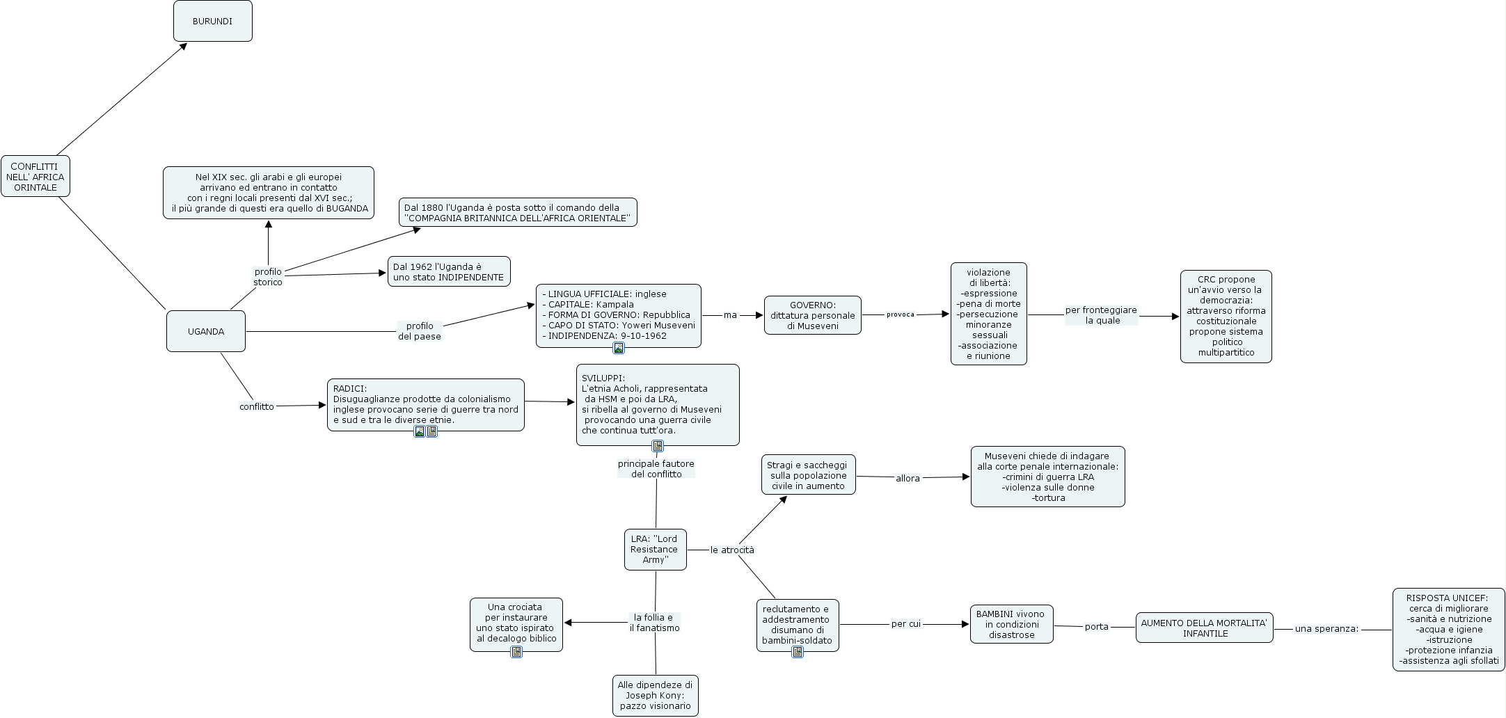 Gruppo 4 Unito ma incompleto(solouganda), AUMENTO DELLA MORTALITA' INFANTILE una speranza: RISPOSTA UNICEF: cerca di migliorare -sanità e nutrizione -acqua e igiene -istruzione -protezione infanzia -assistenza agli sfollati, - LINGUA UFFICIALE: inglese - CAPITALE: Kampala - FORMA DI GOVERNO: Repubblica - CAPO DI STATO: Yoweri Museveni - INDIPENDENZA: 9-10-1962 ma GOVERNO: dittatura personale di Museveni, Stragi e saccheggi sulla popolazione civile in aumento allora Museveni chiede di indagare alla corte penale internazionale: -crimini di guerra LRA -violenza sulle donne -tortura, AUMENTO DELLA MORTALITA' INFANTILE una speranza: RISPOSTA UNICEF: cerca di migliorare -sanità e nutrizione -acqua e igiene -istruzione -protezione infanzia -assistenza agli sfollati, LRA: "Lord Resistance Army" la follia e il fanatismo Una crociata per instaurare uno stato ispirato al decalogo biblico, SVILUPPI: L'etnia Acholi, rappresentata da HSM e poi da LRA, si ribella al governo di Museveni provocando una guerra civile che continua tutt'ora. principale fautore del conflitto LRA: "Lord Resistance Army", CONFLITTI NELL' AFRICA ORINTALE in BURUNDI, UGANDA profilo storico Nel XIX sec. gli arabi e gli europei arrivano ed entrano in contatto con i regni locali presenti dal XVI sec.; il più grande di questi era quello di BUGANDA, UGANDA conflitto RADICI: Disuguaglianze prodotte da colonialismo inglese provocano serie di guerre tra nord e sud e tra le diverse etnie., LRA: "Lord Resistance Army" la follia e il fanatismo Una crociata per instaurare uno stato ispirato al decalogo biblico