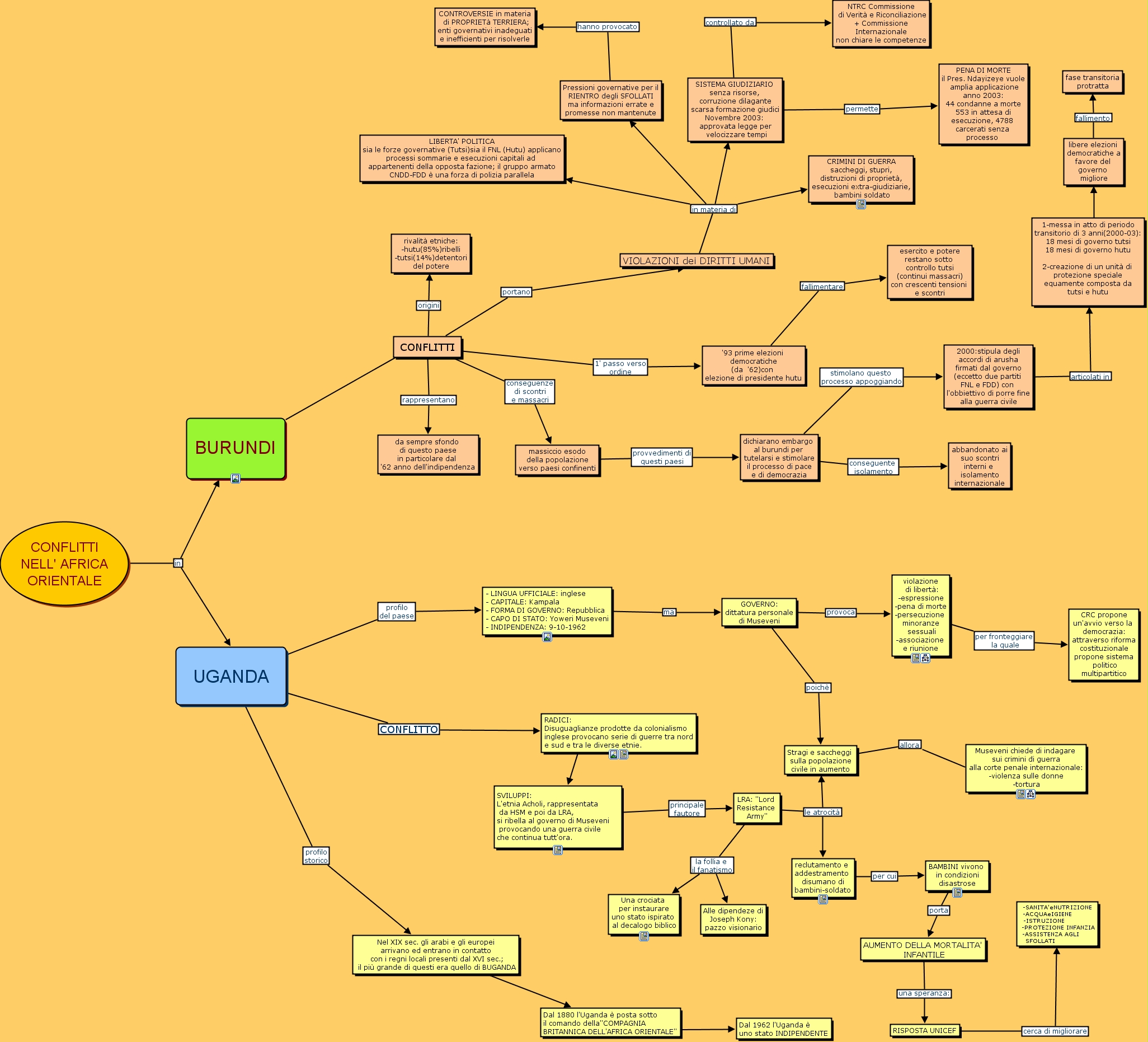 MAPPA DEFINITIVA ufficiale, LRA: "Lord Resistance Army" le atrocità reclutamento e addestramento disumano di bambini-soldato, AUMENTO DELLA MORTALITA' INFANTILE una speranza: RISPOSTA UNICEF, dichiarano embargo al burundi per tutelarsi e stimolare il processo di pace e di democrazia conseguente isolamento abbandonato ai suo scontri interni e isolamento internazionale, VIOLAZIONI dei DIRITTI UMANI in materia di LIBERTA' POLITICA sia le forze governative (Tutsi)sia il FNL (Hutu) applicano processi sommarie e esecuzioni capitali ad appartenenti della opposta fazione; il gruppo armato CNDD-FDD è una forza di polizia parallela, CONFLITTI conseguenze di scontri e massacri massiccio esodo della popolazione verso paesi confinenti, CONFLITTI rappresentano da sempre sfondo di questo paese in particolare dal '62 anno dell'indipendenza, LRA: "Lord Resistance Army" la follia e il fanatismo Una crociata per instaurare uno stato ispirato al decalogo biblico, CONFLITTI 1' passo verso ordine '93 prime elezioni democratiche (da '62)con elezione di presidente hutu, SISTEMA GIUDIZIARIO senza risorse, corruzione dilagante scarsa formazione giudici Novembre 2003: approvata legge per velocizzare tempi permette PENA DI MORTE il Pres. Ndayizeye vuole amplia applicazione anno 2003: 44 condanne a morte 553 in attesa di esecuzione, 4788 carcerati senza processo, '93 prime elezioni democratiche (da '62)con elezione di presidente hutu fallimentare esercito e potere restano sotto controllo tutsi (continui massacri) con crescenti tensioni e scontri