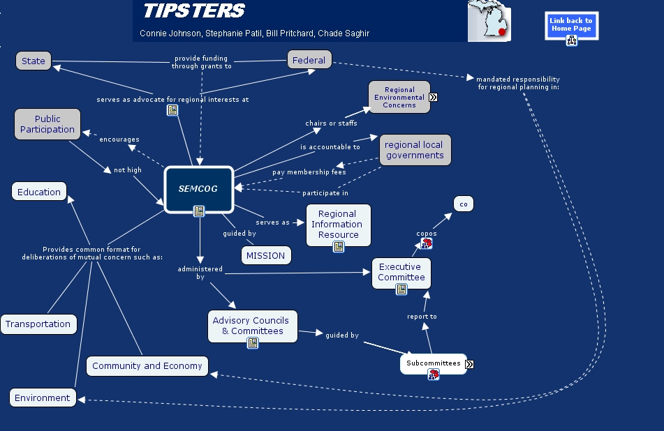 SEMCOG, State provide funding through grants to SEMCOG, Advisory Councils & Committees guided by Finance&Budget, SEMCOG serves as Regional Information Resource, Subcommittees report to Executive Committee, SEMCOG Provides common format for deliberations of mutual concern such as: Environment, SEMCOG is accountable to regional local governments, SEMCOG Provides common format for deliberations of mutual concern such as: Community and Economy, Advisory Councils & Committees guided by EPAC, SEMCOG chairs or staffs Regional Solid Waste Policy Committee, SEMCOG guided by MISSION