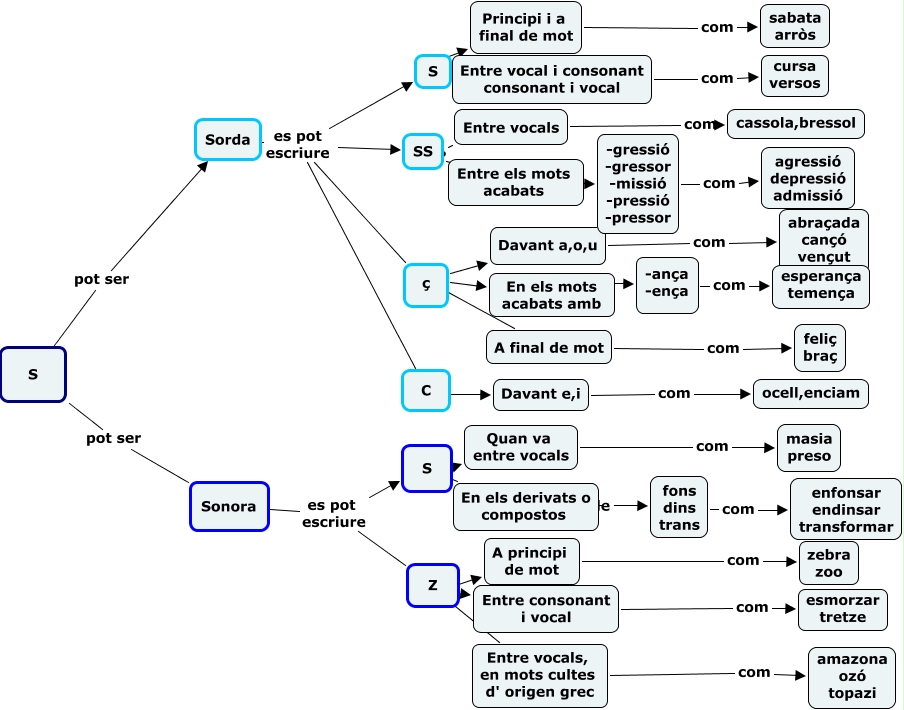 Este Cmap, tiene información relacionada con: Ortografia S, Entre vocals com cassola,bressol, Z ???? Entre vocals, en mots cultes d' origen grec, A final de mot com feliç braç, Davant e,i com ocell,enciam, ç ???? En els mots acabats amb, Sorda es pot escriure ç, S pot ser Sonora, Entre consonant i vocal com esmorzar tretze, ç ???? Davant a,o,u, Davant a,o,u com abraçada cançó vençut, S a Principi i a final de mot, Sorda es pot escriure C, Entre vocal i consonant consonant i vocal com cursa versos, Sonora es pot escriure Z, Sorda es pot escriure S, Quan va entre vocals com masia preso, Sonora es pot escriure S, -ança -ença com esperança temença, En els mots acabats amb ???? -ança -ença, Principi i a final de mot com sabata arròs
