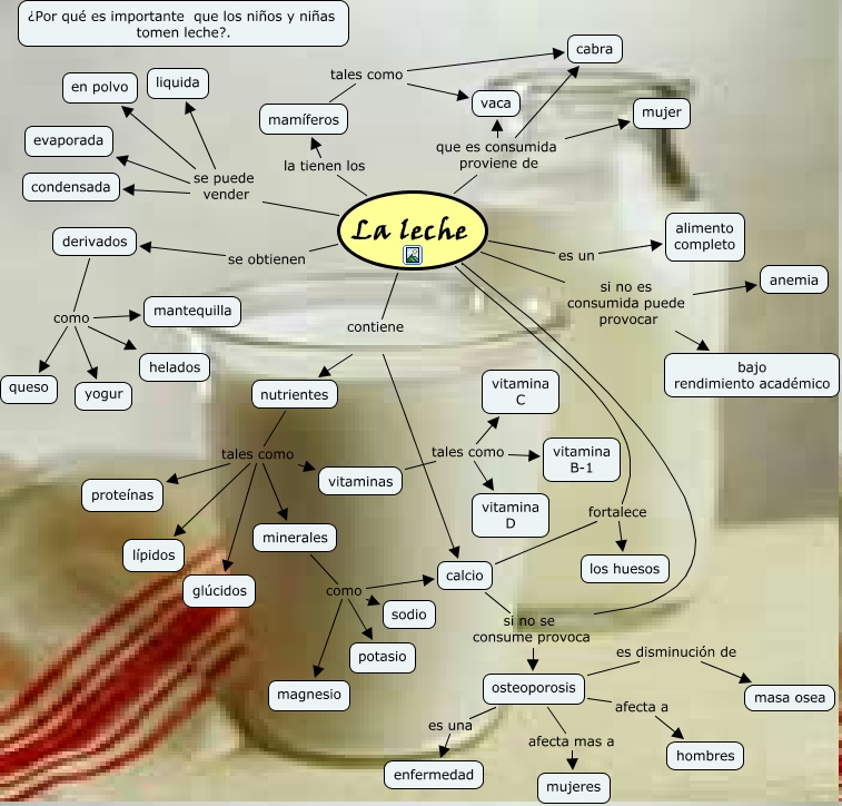 la leche, La leche la tienen los mamíferos, nutrientes tales como glúcidos, mamíferos tales como vaca, La leche es un alimento completo, nutrientes tales como minerales, osteoporosis afecta mas a mujeres, osteoporosis es disminución de masa osea, mamíferos tales como cabra, La leche se puede vender en polvo, nutrientes tales como proteínas