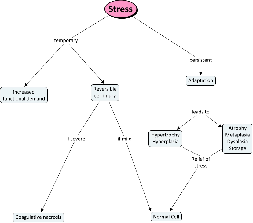 Effects of Stress, Stress temporary Reversible cell injury, Adaptation leads to Hypertrophy Hyperplasia, Stress temporary increased functional demand, Stress persistent Adaptation, Hypertrophy Hyperplasia Relief of stress Normal Cell, Atrophy Metaplasia Dysplasia Storage Relief of stress Normal Cell, Adaptation leads to Atrophy Metaplasia Dysplasia Storage, Reversible cell injury if severe Coagulative necrosis, Reversible cell injury if mild Normal Cell