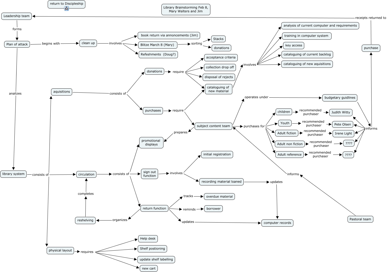 Library system, clean up involves book return via annoncements (Jim), sign out function involves recording material loaned, cataloguing of new material involves analysis of current computer and requirements, return function updates computer records, donations require collection drop off, Plan of attack analizes library system, cataloguing of new material involves cataloguing of new aquisitions, reshelving completes circulation, return function reminds borrower, cataloguing of new material involves training in computer system