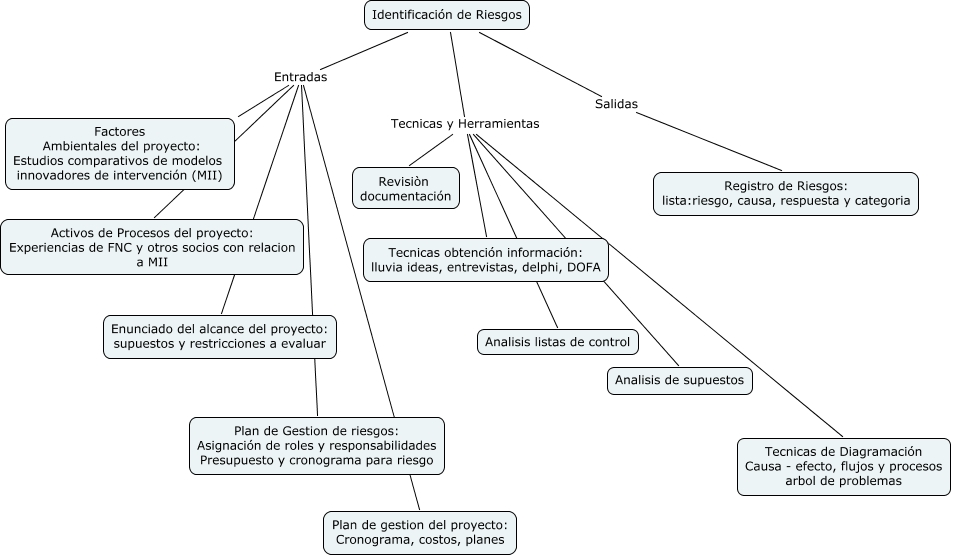 identificaci+¦n riesgos, Identificación de Riesgos Entradas Activos de Procesos del proyecto: Experiencias de FNC y otros socios con relacion a MII, Identificación de Riesgos Entradas Plan de Gestion de riesgos: Asignación de roles y responsabilidades Presupuesto y cronograma para riesgo, Identificación de Riesgos Entradas Enunciado del alcance del proyecto: supuestos y restricciones a evaluar, Identificación de Riesgos Tecnicas y Herramientas Tecnicas de Diagramación Causa - efecto, flujos y procesos arbol de problemas, Identificación de Riesgos Salidas Registro de Riesgos: lista:riesgo, causa, respuesta y categoria, Identificación de Riesgos Tecnicas y Herramientas Analisis listas de control, Identificación de Riesgos Tecnicas y Herramientas Tecnicas obtención información: lluvia ideas, entrevistas, delphi, DOFA, Identificación de Riesgos Tecnicas y Herramientas Analisis de supuestos, Identificación de Riesgos Tecnicas y Herramientas Revisiòn documentación, Identificación de Riesgos Entradas Plan de gestion del proyecto: Cronograma, costos, planes