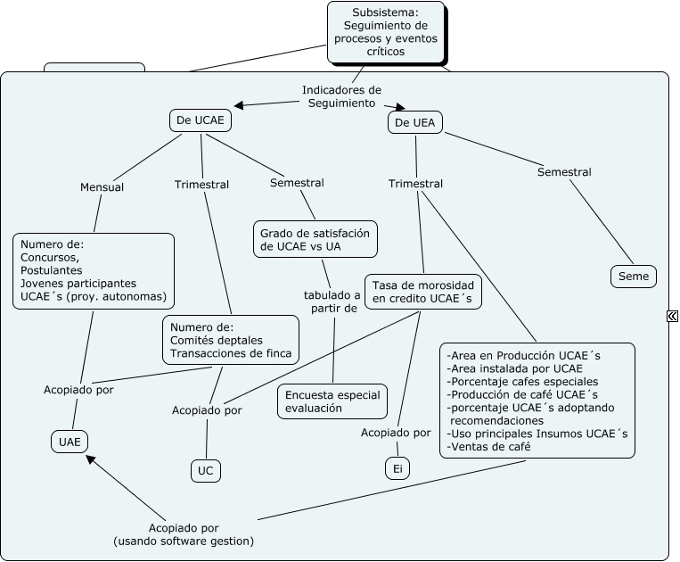 subsistema seguimiento, De UCAE Mensual Numero de: Concursos, Postulantes Jovenes participantes UCAE´s (proy. autonomas), De UEA Trimestral -Area en Producción UCAE´s -Area instalada por UCAE -Porcentaje cafes especiales -Producción de café UCAE´s -porcentaje UCAE´s adoptando recomendaciones -Uso principales Insumos UCAE´s -Ventas de café, Tasa de morosidad en credito UCAE´s Acopiado por UC, De UEA Semestral Seme, Subsistema: Seguimiento de procesos y eventos críticos Objetivos Identificar eventos críticos y riesgos del proyecto, Subsistema: Seguimiento de procesos y eventos críticos Indicadores de Seguimiento De UEA, Subsistema: Seguimiento de procesos y eventos críticos Instrumentos inst, De UEA Trimestral Tasa de morosidad en credito UCAE´s, Subsistema: Seguimiento de procesos y eventos críticos Indicadores de Seguimiento De UCAE, Tasa de morosidad en credito UCAE´s Acopiado por Ei