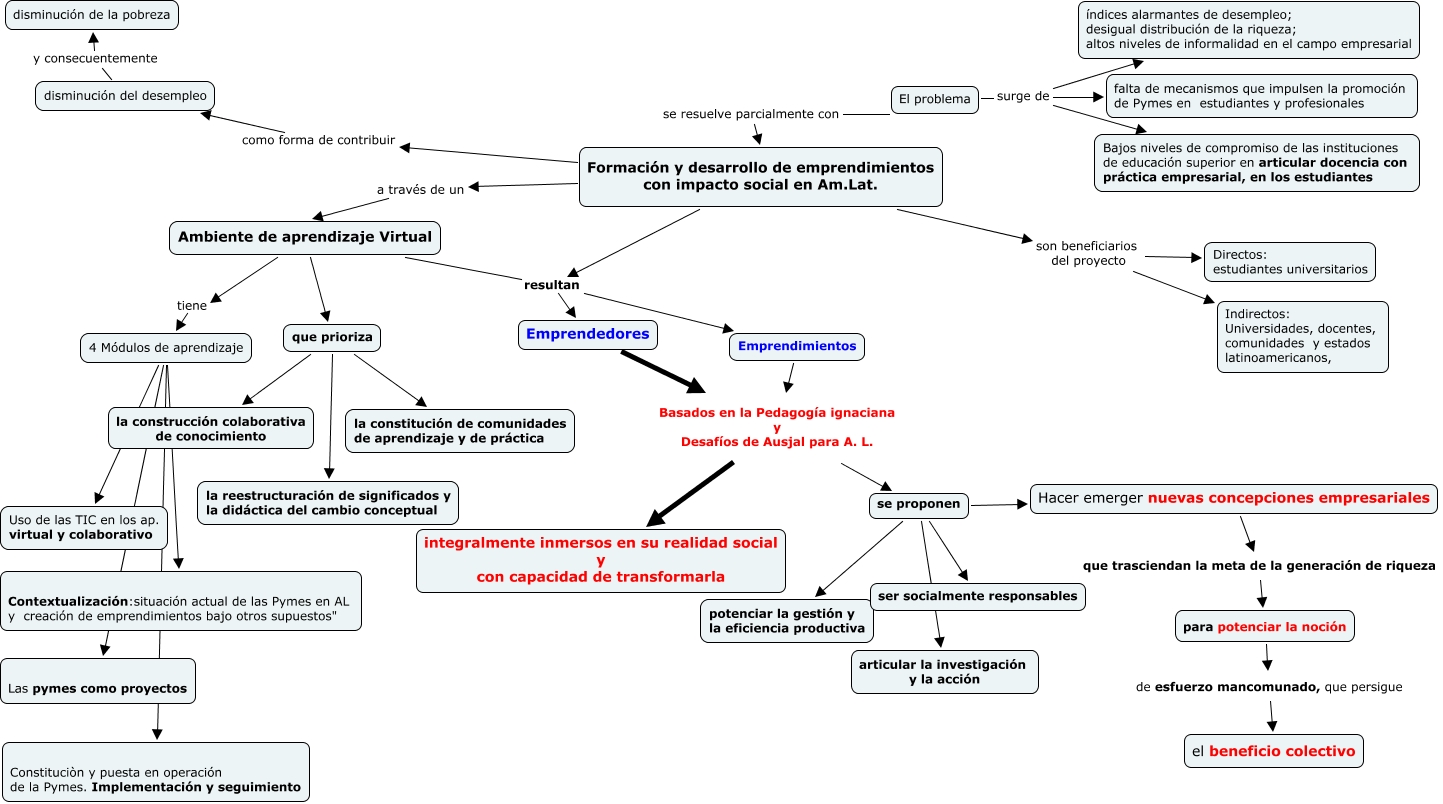 Economia-Proyecto final, 4 Módulos de aprendizaje Uso de las TIC en los ap. virtual y colaborativo, se proponen ser socialmente responsables, que prioriza la reestructuración de significados y la didáctica del cambio conceptual, El problema surge de índices alarmantes de desempleo; desigual distribución de la riqueza; altos niveles de informalidad en el campo empresarial, El problema surge de Bajos niveles de compromiso de las instituciones de educación superior en articular docencia con práctica empresarial, en los estudiantes, El problema surge de falta de mecanismos que impulsen la promoción de Pymes en estudiantes y profesionales, Emprendimientos Basados en la Pedagogía ignaciana y Desafíos de Ausjal para A. L. integralmente inmersos en su realidad social y con capacidad de transformarla, Emprendimientos Basados en la Pedagogía ignaciana y Desafíos de Ausjal para A. L. se proponen, que prioriza la constitución de comunidades de aprendizaje y de práctica, El problema se resuelve parcialmente con Formación y desarrollo de emprendimientos con impacto social en Am.Lat.