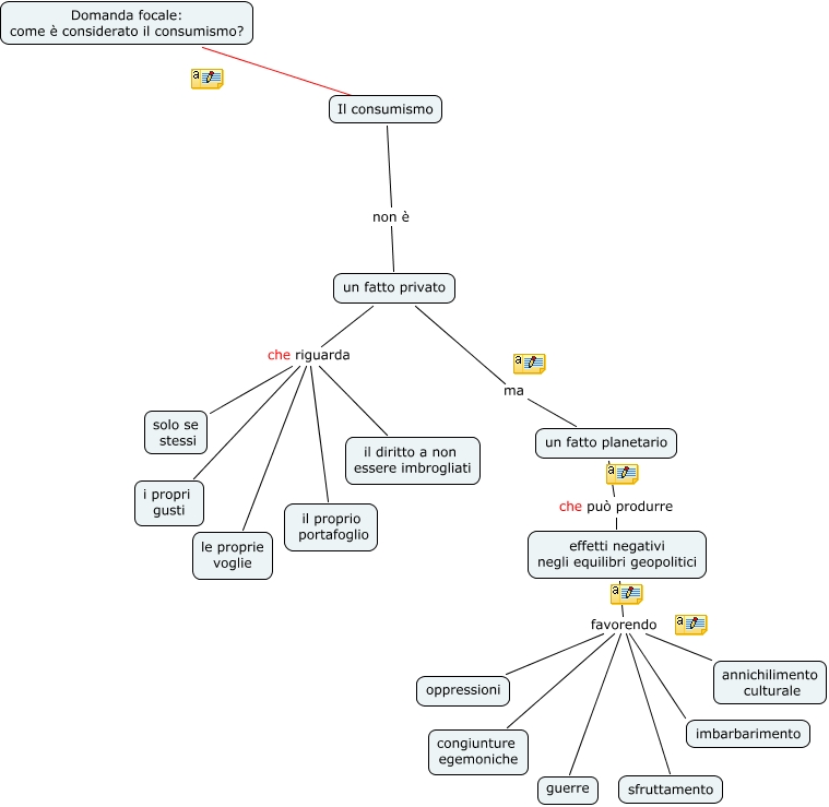 mappa consumismo, effetti negativi negli equilibri geopolitici favorendo sfruttamento, Il consumismo non è un fatto privato, effetti negativi negli equilibri geopolitici favorendo congiunture egemoniche, effetti negativi negli equilibri geopolitici favorendo oppressioni, effetti negativi negli equilibri geopolitici favorendo guerre, effetti negativi negli equilibri geopolitici favorendo imbarbarimento, un fatto privato che riguarda le proprie voglie, effetti negativi negli equilibri geopolitici favorendo annichilimento culturale, un fatto privato che riguarda solo se stessi, un fatto privato che riguarda il proprio portafoglio
