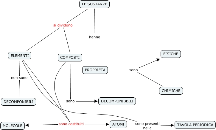 Le Sostanze, LE SOSTANZE si dividono COMPOSTI, LE SOSTANZE hanno PROPRIETA, ELEMENTI sono presenti nella TAVOLA PERIODICA, ELEMENTI sono costituiti MOLECOLE, COMPOSTI sono costituiti ATOMI, LE SOSTANZE si dividono ELEMENTI, PROPRIETA sono CHIMICHE, COMPOSTI sono DECOMPONIBBILI, COMPOSTI sono costituiti MOLECOLE, ELEMENTI sono costituiti ATOMI