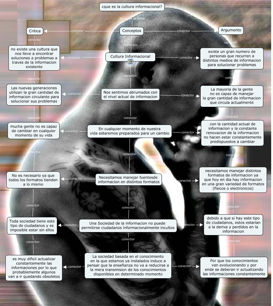 que es la cultura informacional, Las nuevas generaciones utilizan la gran cantidad de informacion circulante para solucionar sus problemas conector mucha gente no es capaz de cambiar en cualquier momento de su vida, La mayoria de la gente no es capaz de manejar la gran cantidad de informacion que circula actualmente conector con la cantidad actual de informacion y la constante renovacion de la informacion no hacen estar constantemente predispuestos a cambiar, Conceptos conector Argumento, Nos sentimos abrumados con el nivel actual de informacion conector La mayoria de la gente no es capaz de manejar la gran cantidad de informacion que circula actualmente, Una Sociedad de la informacion no puede permitirse ciudadanos informacionalmente incultos conector Toda sociedad tiene este tipo de ciudadanos y es imposible estar sin ellos, En cualquier momento de nuestra vida estaremos preparados para un cambio conector Necesitamos manejar fuentesde informacion en distintos formatos, necesitamos manejar distintos formatos de informacion ya que hoy en dia hay informacion en una gran variedad de formatos (fisicos o electronicos) conector debido a que si hay este tipo de ciudadanos, estos estarian a la deriva y perdidos en la informacion, existe un gran numero de personas que recurren a distintos medios de informacion para solucionar problemas conector La mayoria de la gente no es capaz de manejar la gran cantidad de informacion que circula actualmente, ¿que es la cultura informacional? inicio de la tarea Conceptos, En cualquier momento de nuestra vida estaremos preparados para un cambio conector mucha gente no es capaz de cambiar en cualquier momento de su vida