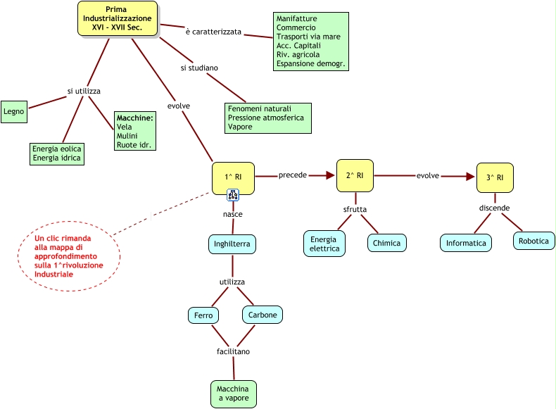 Questa Cmap, creata con IHMC CmapTools, contiene informazioni relative a: Mappa indice RI, 2^ RI evolve 3^ RI, Prima Industrializzazione XVI - XVII Sec. si utilizza Legno, Ferro facilitano Macchina a vapore, 3^ RI discende Informatica, Prima Industrializzazione XVI - XVII Sec. è caratterizzata Manifatture Commercio Trasporti via mare Acc. Capitali Riv. agricola Espansione demogr., 1^ RI precede 2^ RI, 3^ RI discende Robotica, Prima Industrializzazione XVI - XVII Sec. si utilizza Energia eolica Energia idrica, Prima Industrializzazione XVI - XVII Sec. si utilizza Macchine: Vela Mulini Ruote idr., Carbone facilitano Macchina a vapore, Inghilterra utilizza Ferro, Prima Industrializzazione XVI - XVII Sec. evolve 1^ RI, Fenomeni naturali Pressione atmosferica Vapore si studiano Prima Industrializzazione XVI - XVII Sec., 2^ RI sfrutta Energia elettrica, Inghilterra utilizza Carbone, Un clic rimanda alla mappa di approfondimento sulla 1^rivoluzione Industriale 1^ RI, 2^ RI sfrutta Chimica, Inghilterra nasce 1^ RI