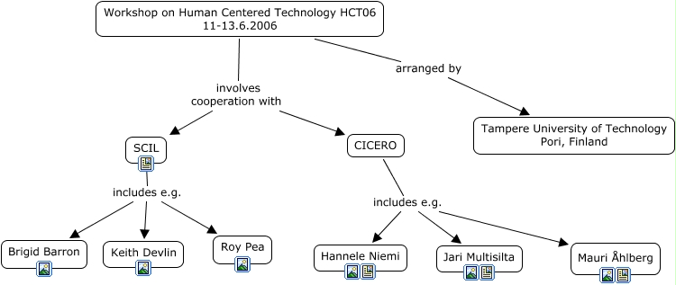 _CmapTools_demomstration_2.4.06, CICERO includes e.g. Mauri Åhlberg, SCIL includes e.g. Keith Devlin, CICERO includes e.g. Jari Multisilta, SCIL includes e.g. Brigid Barron, SCIL includes e.g. Roy Pea, Workshop on Human Centered Technology HCT06 11-13.6.2006 arranged by Tampere University of Technology Pori, Finland, Workshop on Human Centered Technology HCT06 11-13.6.2006 involves cooperation with SCIL, CICERO includes e.g. Hannele Niemi, Workshop on Human Centered Technology HCT06 11-13.6.2006 involves cooperation with CICERO