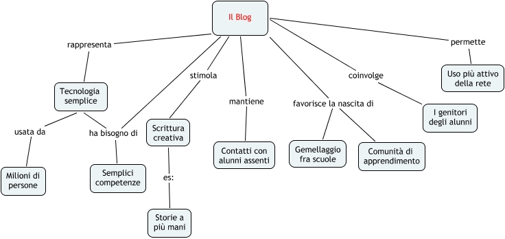 Il Blog, Milioni di persone usata da Tecnologia semplice, Uso più attivo della rete permette Il Blog, Scrittura creativa es: Storie a più mani, Comunità di apprendimento favorisce la nascita di Il Blog, Il Blog ha bisogno di Tecnologia semplice, Il Blog stimola Scrittura creativa, Contatti con alunni assenti mantiene Il Blog, Semplici competenze ha bisogno di Tecnologia semplice, I genitori degli alunni coinvolge Il Blog, Tecnologia semplice rappresenta Il Blog