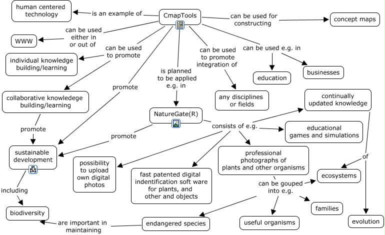 Figure_1, professional photographs of plants and other organisms can be gouped into e.g. ecosystems, CmapTools can be used for constructing concept maps, CmapTools is planned to be applied e.g. in NatureGate(R), professional photographs of plants and other organisms can be gouped into e.g. families, sustainable development including biodiversity, professional photographs of plants and other organisms can be gouped into e.g. useful organisms, NatureGate(R) promote sustainable development, CmapTools can be used either in or out of WWW, CmapTools is an example of human centered technology, endangered species are important in maintaining biodiversity
