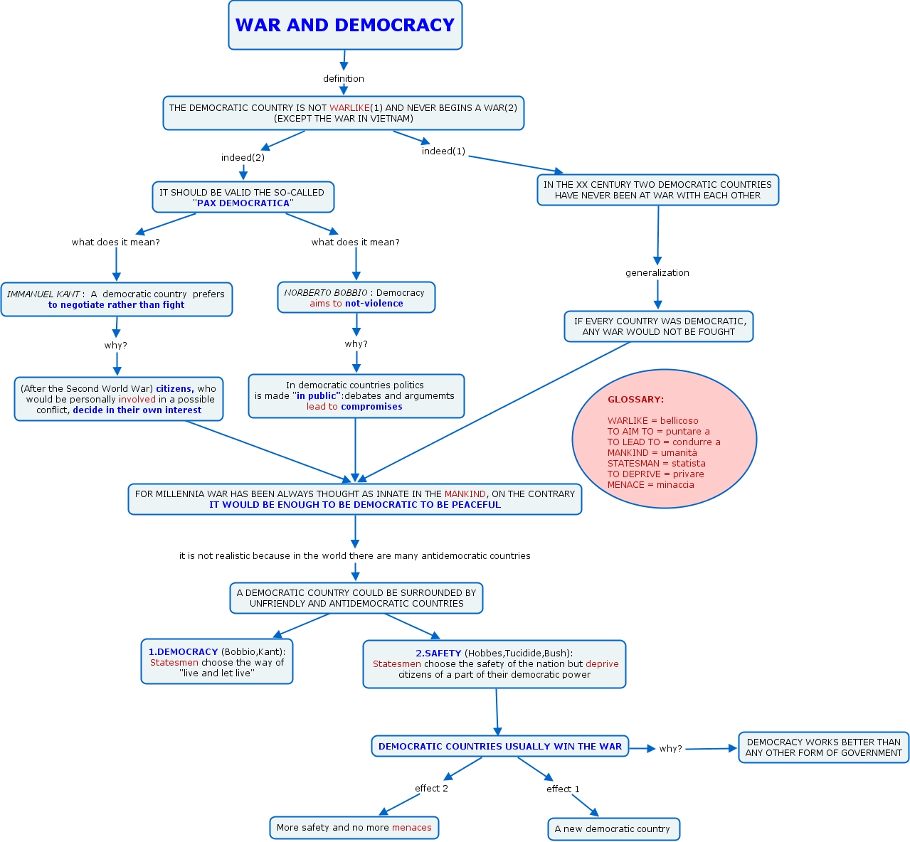 G. E D. FILO INGLESE (DEFINITIVA), IT SHOULD BE VALID THE SO-CALLED "PAX DEMOCRATICA" what does it mean? IMMANUEL KANT: A democratic country prefers to negotiate rather than fight, FOR MILLENNIA WAR HAS BEEN ALWAYS THOUGHT AS INNATE IN THE MANKIND, ON THE CONTRARY IT WOULD BE ENOUGH TO BE DEMOCRATIC TO BE PEACEFUL it is not realistic because in the world there are many antidemocratic countries A DEMOCRATIC COUNTRY COULD BE SURROUNDED BY UNFRIENDLY AND ANTIDEMOCRATIC COUNTRIES, THE DEMOCRATIC COUNTRY IS NOT WARLIKE(1) AND NEVER BEGINS A WAR(2) (EXCEPT THE WAR IN VIETNAM) indeed(2) IT SHOULD BE VALID THE SO-CALLED "PAX DEMOCRATICA", WAR AND DEMOCRACY definition THE DEMOCRATIC COUNTRY IS NOT WARLIKE(1) AND NEVER BEGINS A WAR(2) (EXCEPT THE WAR IN VIETNAM), THE DEMOCRATIC COUNTRY IS NOT WARLIKE(1) AND NEVER BEGINS A WAR(2) (EXCEPT THE WAR IN VIETNAM) indeed(1) IN THE XX CENTURY TWO DEMOCRATIC COUNTRIES HAVE NEVER BEEN AT WAR WITH EACH OTHER, IMMANUEL KANT: A democratic country prefers to negotiate rather than fight why? (After the Second World War) citizens, who would be personally involved in a possible conflict, decide in their own interest, (After the Second World War) citizens, who would be personally involved in a possible conflict, decide in their own interest ???? FOR MILLENNIA WAR HAS BEEN ALWAYS THOUGHT AS INNATE IN THE MANKIND, ON THE CONTRARY IT WOULD BE ENOUGH TO BE DEMOCRATIC TO BE PEACEFUL, IT SHOULD BE VALID THE SO-CALLED "PAX DEMOCRATICA" what does it mean? NORBERTO BOBBIO: Democracy aims to not-violence, 2.SAFETY (Hobbes,Tucidide,Bush): Statesmen choose the safety of the nation but deprive citizens of a part of their democratic power ???? DEMOCRATIC COUNTRIES USUALLY WIN THE WAR, In democratic countries politics is made "in public":debates and argumemts lead to compromises ???? FOR MILLENNIA WAR HAS BEEN ALWAYS THOUGHT AS INNATE IN THE MANKIND, ON THE CONTRARY IT WOULD BE ENOUGH TO BE DEMOCRATIC TO BE PEACEFUL