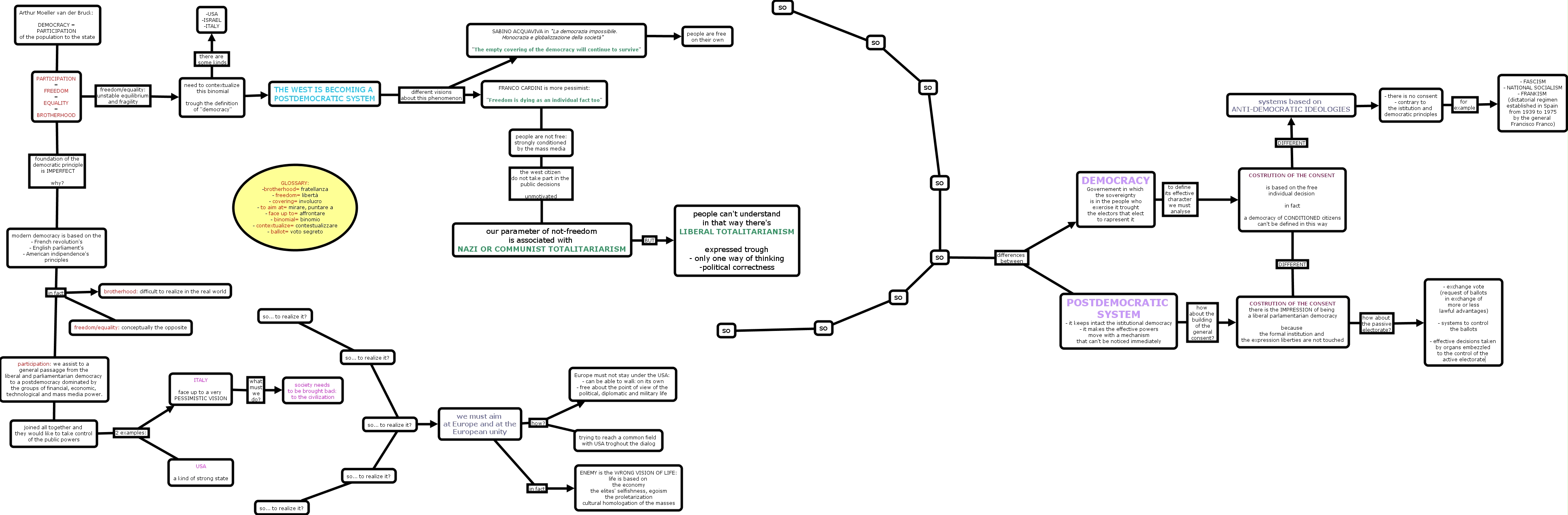 mappa democrazia paola inglese, so ???? so, so ???? so, need to contextualize this binomial trough the definition of "democracy" ???? THE WEST IS BECOMING A POSTDEMOCRATIC SYSTEM, so ???? so, so... to realize it? ???? we must aim at Europe and at the European unity, FRANCO CARDINI is more pessimist: "Freedom is dying as an individual fact too" ???? people are not free: strongly conditioned by the mass media, PARTICIPATION = FREEDOM = EQUALITY = BROTHERHOOD freedom/equality: unstable equilibrium and fragility need to contextualize this binomial trough the definition of "democracy", participation: we assist to a general passagge from the liberal and parliamentarian democracy to a postdemocracy dominated by the groups of financial, economic, technological and mass media power. ???? joined all together and they would like to take control of the public powers, SABINO ACQUAVIVA in "La democrazia impossibile. Monocrazia e globalizzazione della società " "The empty covering of the democracy will continue to survive" ???? people are free on their own, need to contextualize this binomial trough the definition of "democracy" there are some kinds -USA -ISRAEL -ITALY