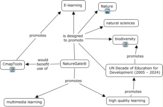 Fig_1, NatureGate® would benefit use of CmapTools, NatureGate® is designed to promote E-learning, high quality learning promotes UN Decade of Education for Development (2005 – 2024), NatureGate® promotes high quality learning, UN Decade of Education for Development (2005 – 2024) promotes biodiversity, CmapTools promotes E-learning, NatureGate® is designed to promote natural sciences, NatureGate® promotes multimedia learning, NatureGate® is designed to promote UN Decade of Education for Development (2005 – 2024), NatureGate® is designed to promote biodiversity