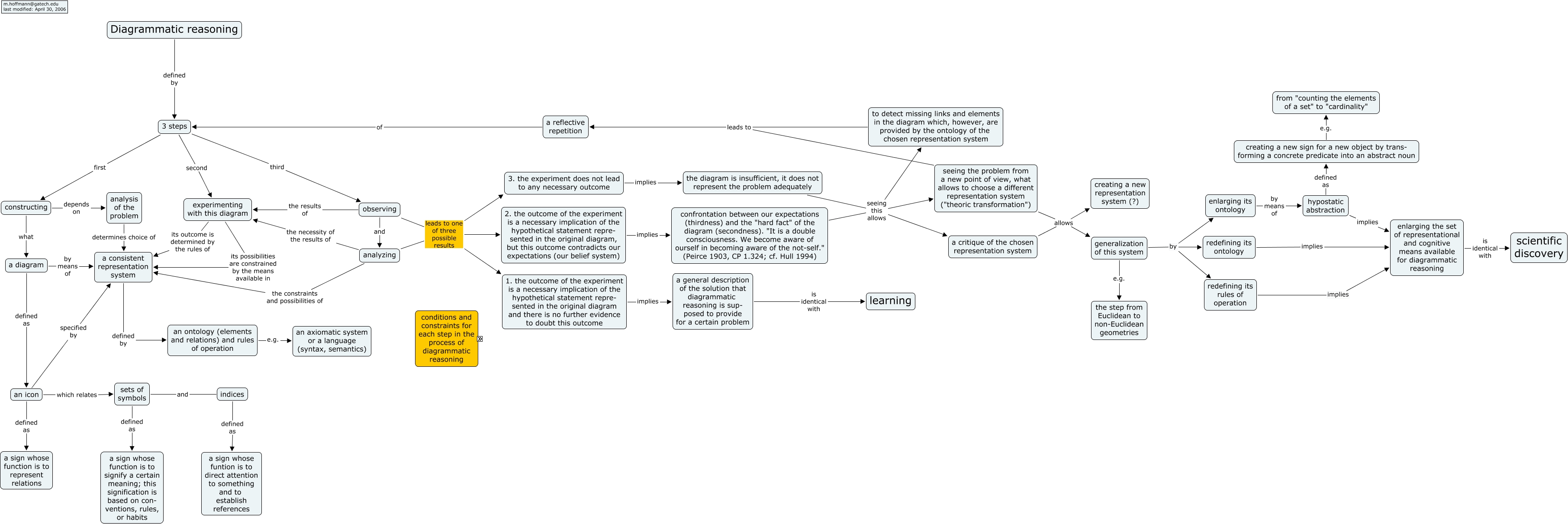diagrammatic reasoning definition, a consistent representation system defined by an ontology (elements and relations) and rules of operation, creating a new sign for a new object by trans- forming a concrete predicate into an abstract noun e.g. from "counting the elements of a set" to "cardinality", analyzing leads to one of three possible results 1. the outcome of the experiment is a necessary implication of the hypothetical statement repre- sented in the original diagram and there is no further evidence to doubt this outcome, observing leads to one of three possible results 1. the outcome of the experiment is a necessary implication of the hypothetical statement repre- sented in the original diagram and there is no further evidence to doubt this outcome, analyzing leads to one of three possible results 3. the experiment does not lead to any necessary outcome, 1. the outcome of the experiment is a necessary implication of the hypothetical statement repre- sented in the original diagram and there is no further evidence to doubt this outcome implies a general description of the solution that diagrammatic reasoning is sup- posed to provide for a certain problem, observing the results of experimenting with this diagram, analyzing the necessity of the results of experimenting with this diagram, 3 steps first constructing, enlarging the set of representational and cognitive means available for diagrammatic reasoning is identical with scientific discovery