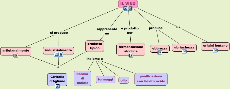 Questa Mappa Concettuale ha informazioni correlate a: Il vino, prodotto tipico insieme a panificazione con lievito acido, IL VINO produce ubriachezza, industrialmente a Civitella d'Agliano, IL VINO rappresenta un prodotto tipico, prodotto tipico insieme a salumi di maiale, prodotto tipico insieme a olio, prodotto tipico a Civitella d'Agliano, IL VINO si produce industrialmente, IL VINO è prodotto per fermentazione alcolica, IL VINO ha origini lontane, IL VINO produce ebbrezza, artigianalmente a Civitella d'Agliano, prodotto tipico insieme a formaggi, IL VINO si produce artigianalmente