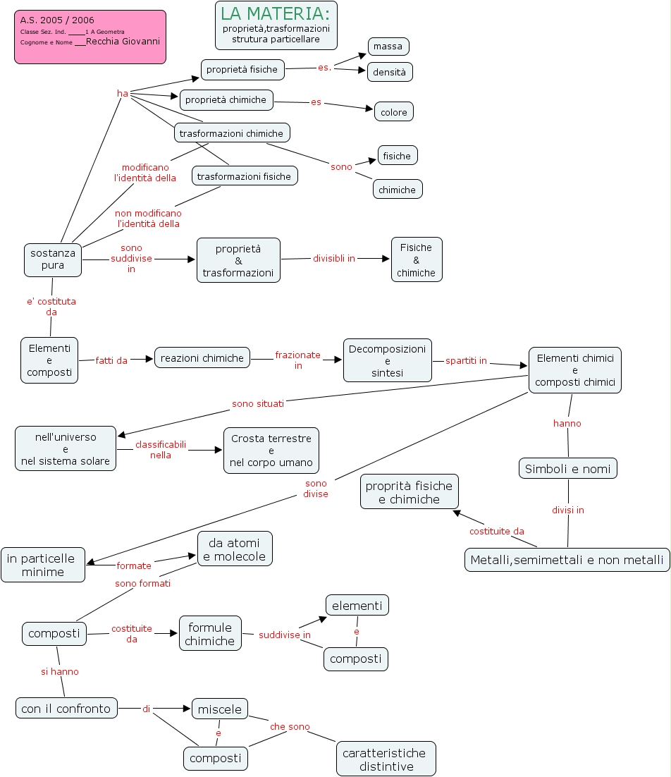 la materia(proprietà,trasformazioni,strutture particcelari)(cap.2), sostanza pura ha trasformazioni fisiche, proprietà & trasformazioni divisibli in Fisiche & chimiche, proprietà fisiche es. densità, proprietà chimiche es colore, trasformazioni chimiche sono fisiche, trasformazioni chimiche sono chimiche, Elementi chimici e composti chimici sono situati nell'universo e nel sistema solare, nell'universo e nel sistema solare classificabili nella Crosta terrestre e nel corpo umano, miscele e composti, in particelle minime formate da atomi e molecole