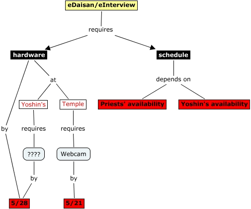 eDaisan, Yoshin's requires ????, hardware at Temple, ???? by 5/28, schedule depends on Yoshin's availability, Temple requires Webcam, hardware by 5/28, schedule depends on Priests' availability, hardware at Yoshin's, Webcam by 5/21, eDaisan/eInterview requires hardware