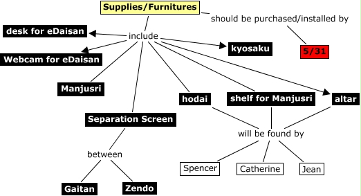 furnitures, Supplies/Furnitures include hodai, Separation Screen between Zendo, Supplies/Furnitures include Separation Screen, Supplies/Furnitures include altar, Supplies/Furnitures include Manjusri, Supplies/Furnitures should be purchased/installed by 5/31, shelf for Manjusri will be found by Jean, Supplies/Furnitures include shelf for Manjusri, Supplies/Furnitures include Webcam for eDaisan, hodai will be found by Jean