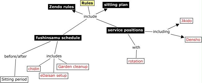 Rules, fushinsamu schedule before/after Sitting period, service positions including Jikido, service positions including Densho, Rules include service positions, fushinsamu schedule includes chidin, Rules include sitting plan, Rules include Zendo rules, service positions with rotation, Rules include fushinsamu schedule, fushinsamu schedule includes eDaisan setup