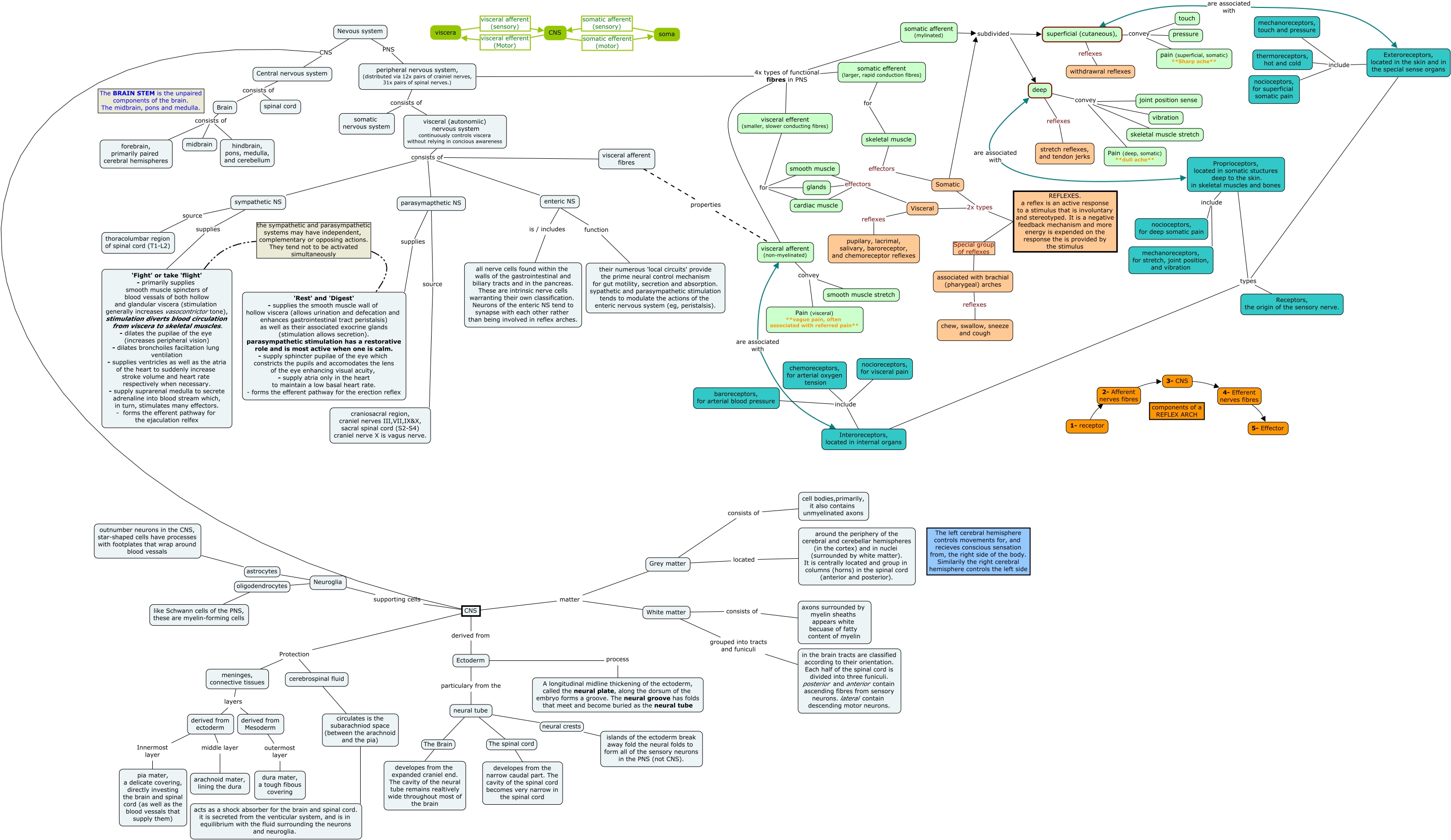This Concept Map, created with IHMC CmapTools, has information related to: nervous system, Grey matter consists of cell bodies,primarily, it also contains unmyelinated axons, derived from ectoderm middle layer arachnoid mater, lining the dura, Brain consists of midbrain, parasymapthetic NS supplies 'Rest' and 'Digest' - supplies the smooth muscle wall of hollow viscera (allows urination and defecation and enhances gastrointestinal tract peristalsis) as well as their associated exocrine glands (stimulation allows secretion). parasympathetic stimulation has a restorative role and is most active when one is calm. - supply sphincter pupilae of the eye which constricts the pupils and accomodates the lens of the eye enhancing visual acuity, - supply atria only in the heart to maintain a low basal heart rate. - forms the efferent pathway for the erection reflex, sympathetic NS supplies 'Fight' or take 'flight' - primarily supplies smooth muscle spincters of blood vessals of both hollow and glandular viscera (stimulation generally increases vasocontrictor tone), stimulation diverts blood circulation from viscera to skeletal muscles. - dilates the pupilae of the eye (increases peripheral vision) - dilates bronchoiles faciltation lung ventilation - supplies ventricles as well as the atria of the heart to suddenly increase stroke volume and heart rate respectively when necessary. - supply suprarenal medulla to secrete adrenaline into blood stream which, in turn, stimulates many effectors. - forms the efferent pathway for the ejaculation relfex, neural tube The Brain developes from the expanded craniel end. The cavity of the neural tube remains realtively wide throughout most of the brain, deep convey Pain (deep, somatic) **dull ache**, CNS supporting cells Neuroglia, Visceral effectors cardiac muscle, Brain consists of forebrain, primarily paired cerebral hemispheres, peripheral nervous system, (distributed via 12x pairs of crainiel nerves, 31x pairs of spinal nerves.) 4x types of functional fibres in PNS visceral afferent (non-myelinated), CNS Protection cerebrospinal fluid, Receptors, the origin of the sensory nerve. types Interoreceptors, located in internal organs, White matter grouped into tracts and funiculi in the brain tracts are classified according to their orientation. Each half of the spinal cord is divided into three funiculi. posterior and anterior contain ascending fibres from sensory neurons. lateral contain descending motor neurons., peripheral nervous system, (distributed via 12x pairs of crainiel nerves, 31x pairs of spinal nerves.) 4x types of functional fibres in PNS visceral efferent (smaller, slower conducting fibres), Nevous system CNS Central nervous system, Receptors, the origin of the sensory nerve. types Exteroreceptors, located in the skin and in the special sense organs, REFLEXES. a reflex is an active response to a stimulus that is involuntary and stereotyped. It is a negative feedback mechanism and more energy is expended on the response the is provided by the stimulus 2x types Visceral, Grey matter located around the periphery of the cerebral and cerebellar hemispheres (in the cortex) and in nuclei (surrounded by white matter). It is centrally located and group in columns (horns) in the spinal cord (anterior and posterior)., visceral afferent fibres properties visceral afferent (non-myelinated)