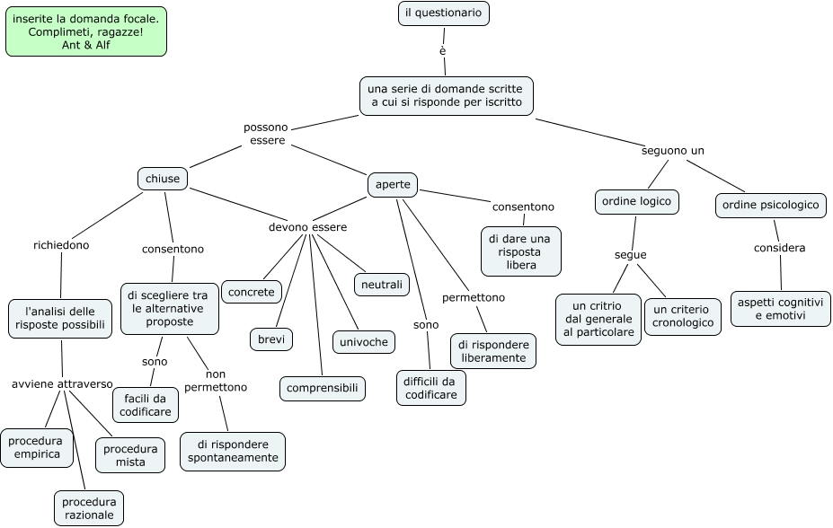 questionario, ordine logico segue un criterio cronologico, chiuse devono essere neutrali, chiuse consentono di scegliere tra le alternative proposte, di scegliere tra le alternative proposte sono facili da codificare, aperte consentono di dare una risposta libera, l'analisi delle risposte possibili avviene attraverso procedura empirica, aperte sono difficili da codificare, di scegliere tra le alternative proposte non permettono di rispondere spontaneamente, aperte devono essere brevi, chiuse richiedono l'analisi delle risposte possibili