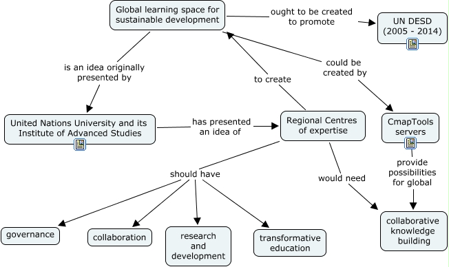 22.5.06_presentation, Regional Centres of expertise should have collaboration, Regional Centres of expertise should have governance, Regional Centres of expertise should have research and development, CmapTools servers provide possibilities for global collaborative knowledge building, Global learning space for sustainable development could be created by CmapTools servers, Global learning space for sustainable development is an idea originally presented by United Nations University and its Institute of Advanced Studies, Regional Centres of expertise to create Global learning space for sustainable development, Global learning space for sustainable development ought to be created to promote UN DESD (2005 - 2014), United Nations University and its Institute of Advanced Studies has presented an idea of Regional Centres of expertise, Regional Centres of expertise would need collaborative knowledge building