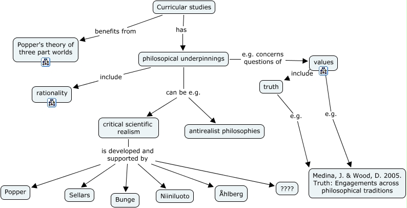 __Curricular_Critical_Sci_realism, philosopical underpinnings e.g. concerns questions of values, philosopical underpinnings include rationality, critical scientific realism is developed and supported by Popper, critical scientific realism is developed and supported by Bunge, Curricular studies has philosopical underpinnings, values include truth, critical scientific realism is developed and supported by Sellars, critical scientific realism is developed and supported by Åhlberg, Curricular studies benefits from Popper's theory of three part worlds, truth e.g. Medina, J. & Wood, D. 2005. Truth: Engagements across philosophical traditions