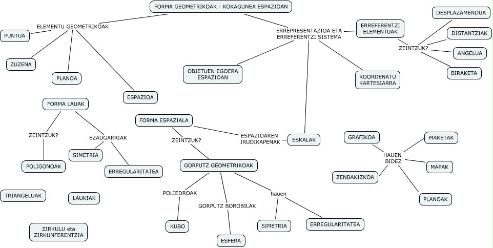 FORMA GEOMETRIKOA, FORMA GEOMETRIKOAK - KOKAGUNEA ESPAZIOAN ERREPRESENTAZIOA ETA ERREFERENTZI SISTEMA KOORDENATU KARTESIARRA, FORMA GEOMETRIKOAK - KOKAGUNEA ESPAZIOAN ELEMENTU GEOMETRIKOAK ZUZENA, FORMA GEOMETRIKOAK - KOKAGUNEA ESPAZIOAN ERREPRESENTAZIOA ETA ERREFERENTZI SISTEMA OBJETUEN EGOERA ESPAZIOAN, GORPUTZ GEOMETRIKOAK hauen ERREGULARITATEA, FORMA GEOMETRIKOAK - KOKAGUNEA ESPAZIOAN ELEMENTU GEOMETRIKOAK PUNTUA, GRAFIKOA HAUEN BIDEZ ZENBAKIZKOA, FORMA GEOMETRIKOAK - KOKAGUNEA ESPAZIOAN ERREPRESENTAZIOA ETA ERREFERENTZI SISTEMA ESKALAK, FORMA LAUAK ZEINTZUK? POLIGONOAK, GRAFIKOA HAUEN BIDEZ MAPAK, GRAFIKOA HAUEN BIDEZ PLANOAK