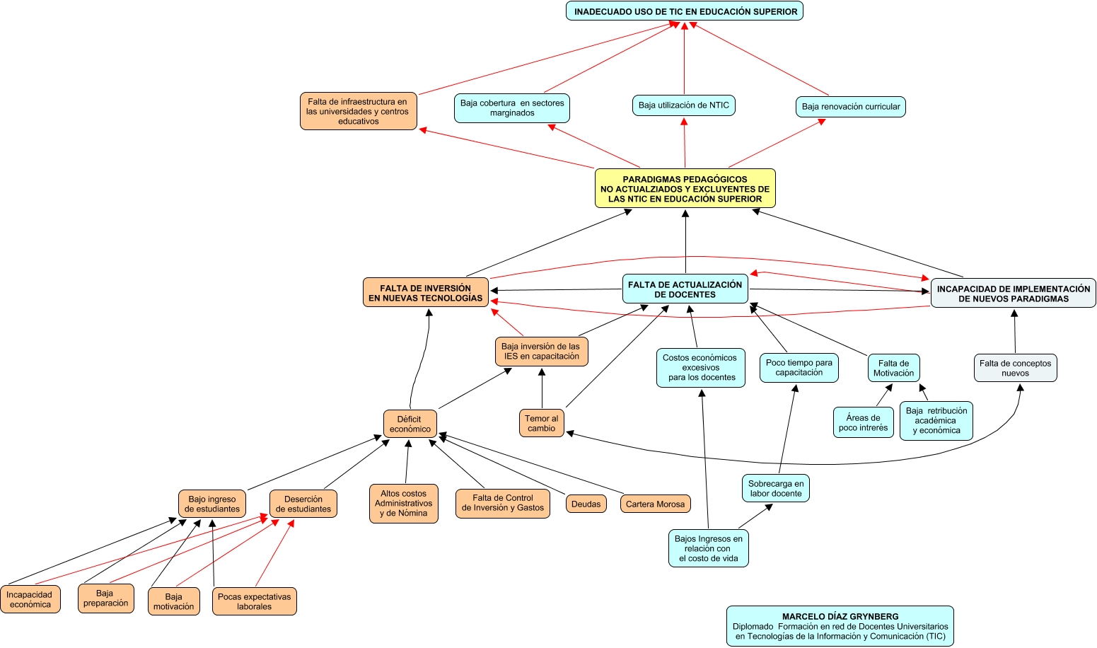 arbol de problemas 2 MARCELO, Baja retribución académica y económica Falta de Motivación, Bajos Ingresos en relación con el costo de vida Sobrecarga en labor docente, INCAPACIDAD DE IMPLEMENTACIÓN DE NUEVOS PARADIGMAS FALTA DE ACTUALIZACIÓN DE DOCENTES, Temor al cambio FALTA DE ACTUALIZACIÓN DE DOCENTES, Pocas expectativas laborales Bajo ingreso de estudiantes, INCAPACIDAD DE IMPLEMENTACIÓN DE NUEVOS PARADIGMAS PARADIGMAS PEDAGÓGICOS NO ACTUALZIADOS Y EXCLUYENTES DE LAS NTIC EN EDUCACIÓN SUPERIOR, Pocas expectativas laborales Deserción de estudiantes, Bajo ingreso de estudiantes Déficit económico, Baja renovación curricular INADECUADO USO DE TIC EN EDUCACIÓN SUPERIOR, Áreas de poco intrerés Falta de Motivación