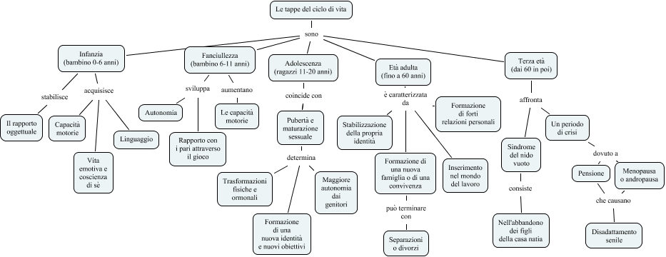 le tappe del ciclo di vita, Età adulta (fino a 60 anni) è caratterizzata da Stabilizzazione della propria identità, Menopausa o andropausa che causano Disadattamento senile, Le tappe del ciclo di vita sono Terza età (dai 60 in poi), Età adulta (fino a 60 anni) è caratterizzata da Formazione di forti relazioni personali, Adolescenza (ragazzi 11-20 anni) coincide con Pubertà e maturazione sessuale, Un periodo di crisi dovuto a Menopausa o andropausa, Pubertà e maturazione sessuale determina Maggiore autonomia dai genitori, Infanzia (bambino 0-6 anni) stabilisce Il rapporto oggettuale, Le tappe del ciclo di vita sono Fanciullezza (bambino 6-11 anni), Pensione che causano Disadattamento senile