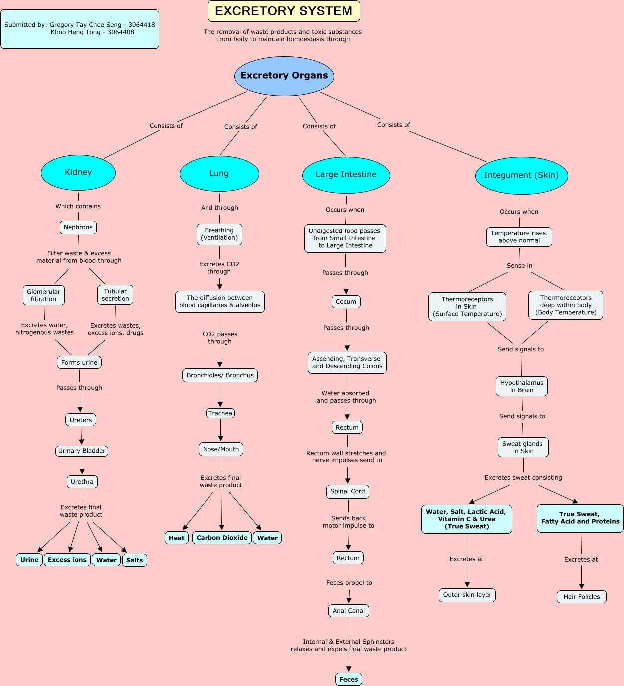 Excretory system dated 6 Jul, Cecum Passes through Ascending, Transverse and Descending Colons, Hypothalamus in Brain Send signals to Sweat glands in Skin, Nose/Mouth Excretes final waste product Heat, Temperature rises above normal Sense in Thermoreceptors in Skin (Surface Temperature), Thermoreceptors in Skin (Surface Temperature) Send signals to Hypothalamus in Brain, Excretory Organs Consists of Kidney, Water, Salt, Lactic Acid, Vitamin C & Urea (True Sweat) Excretes at Outer skin layer, Excretory Organs Consists of Lung, Spinal Cord Sends back motor impulse to Rectum, Urethra Excretes final waste product Salts