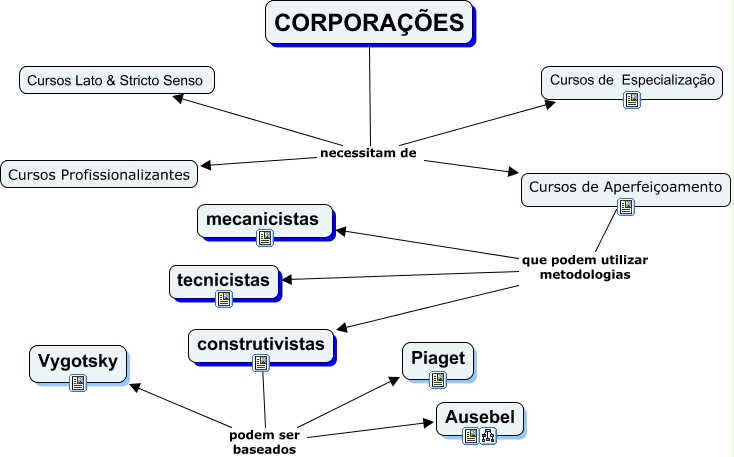 Mapas conceituiais em Monografia - Metodologias, CORPORAÇÕES necessitam de Cursos de Especialização, construtivistas podem ser baseados Piaget, CORPORAÇÕES necessitam de Cursos Lato & Stricto Senso, CORPORAÇÕES necessitam de Cursos de Aperfeiçoamento, construtivistas podem ser baseados Ausebel, Cursos de Aperfeiçoamento que podem utilizar metodologias construtivistas, Cursos de Aperfeiçoamento que podem utilizar metodologias tecnicistas, Cursos de Aperfeiçoamento que podem utilizar metodologias mecanicistas, construtivistas podem ser baseados Vygotsky, CORPORAÇÕES necessitam de Cursos Profissionalizantes
