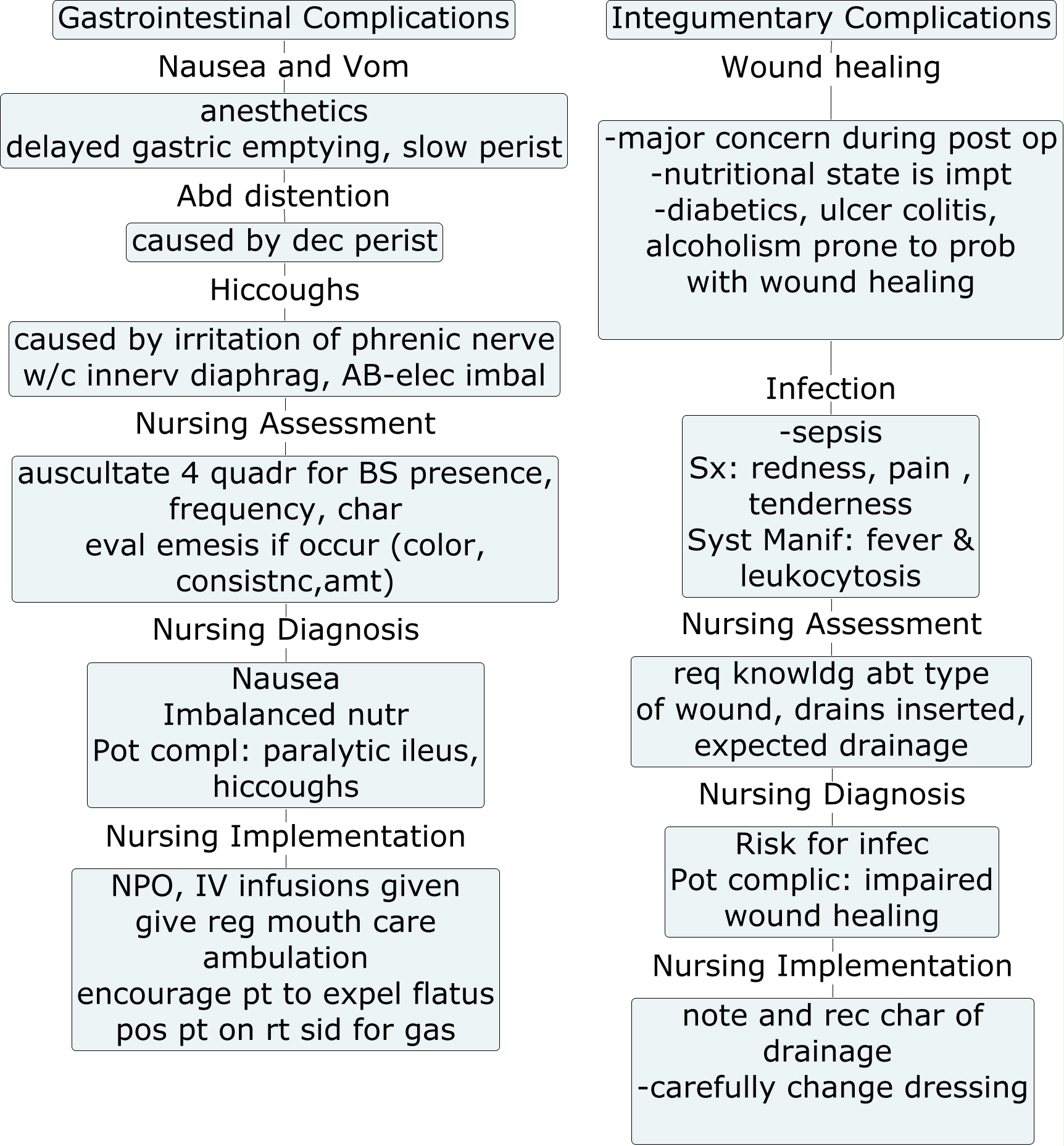 GI and Integumentary Complications, Risk for infec Pot complic: impaired wound healing Nursing Implementation note and rec char of drainage -carefully change dressing, caused by dec perist Hiccoughs caused by irritation of phrenic nerve w/c innerv diaphrag, AB-elec imbal, auscultate 4 quadr for BS presence, frequency, char eval emesis if occur (color, consistnc,amt) Nursing Diagnosis Nausea Imbalanced nutr Pot compl: paralytic ileus, hiccoughs, Nausea Imbalanced nutr Pot compl: paralytic ileus, hiccoughs Nursing Implementation NPO, IV infusions given give reg mouth care ambulation encourage pt to expel flatus pos pt on rt sid for gas, Gastrointestinal Complications Nausea and Vom anesthetics delayed gastric emptying, slow perist, caused by irritation of phrenic nerve w/c innerv diaphrag, AB-elec imbal Nursing Assessment auscultate 4 quadr for BS presence, frequency, char eval emesis if occur (color, consistnc,amt), req knowldg abt type of wound, drains inserted, expected drainage Nursing Diagnosis Risk for infec Pot complic: impaired wound healing, Integumentary Complications Wound healing -major concern during post op -nutritional state is impt -diabetics, ulcer colitis, alcoholism prone to prob with wound healing, anesthetics delayed gastric emptying, slow perist Abd distention caused by dec perist, -sepsis Sx: redness, pain , tenderness Syst Manif: fever & leukocytosis Nursing Assessment req knowldg abt type of wound, drains inserted, expected drainage