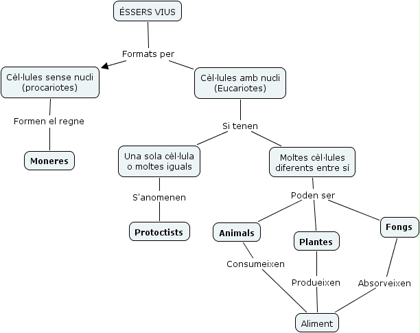 Regnes, Cèl·lules amb nucli (Eucariotes) Si tenen Una sola cèl·lula o moltes iguals, Cèl·lules amb nucli (Eucariotes) Si tenen Moltes cèl·lules diferents entre sí, Una sola cèl·lula o moltes iguals S'anomenen Protoctists, Plantes Produeixen Aliment, ÉSSERS VIUS Formats per Cèl·lules amb nucli (Eucariotes), Moltes cèl·lules diferents entre sí Poden ser Fongs, Moltes cèl·lules diferents entre sí Poden ser Plantes, ÉSSERS VIUS Formats per Cèl·lules sense nucli (procariotes), Cèl·lules sense nucli (procariotes) Formen el regne Moneres, Moltes cèl·lules diferents entre sí Poden ser Animals