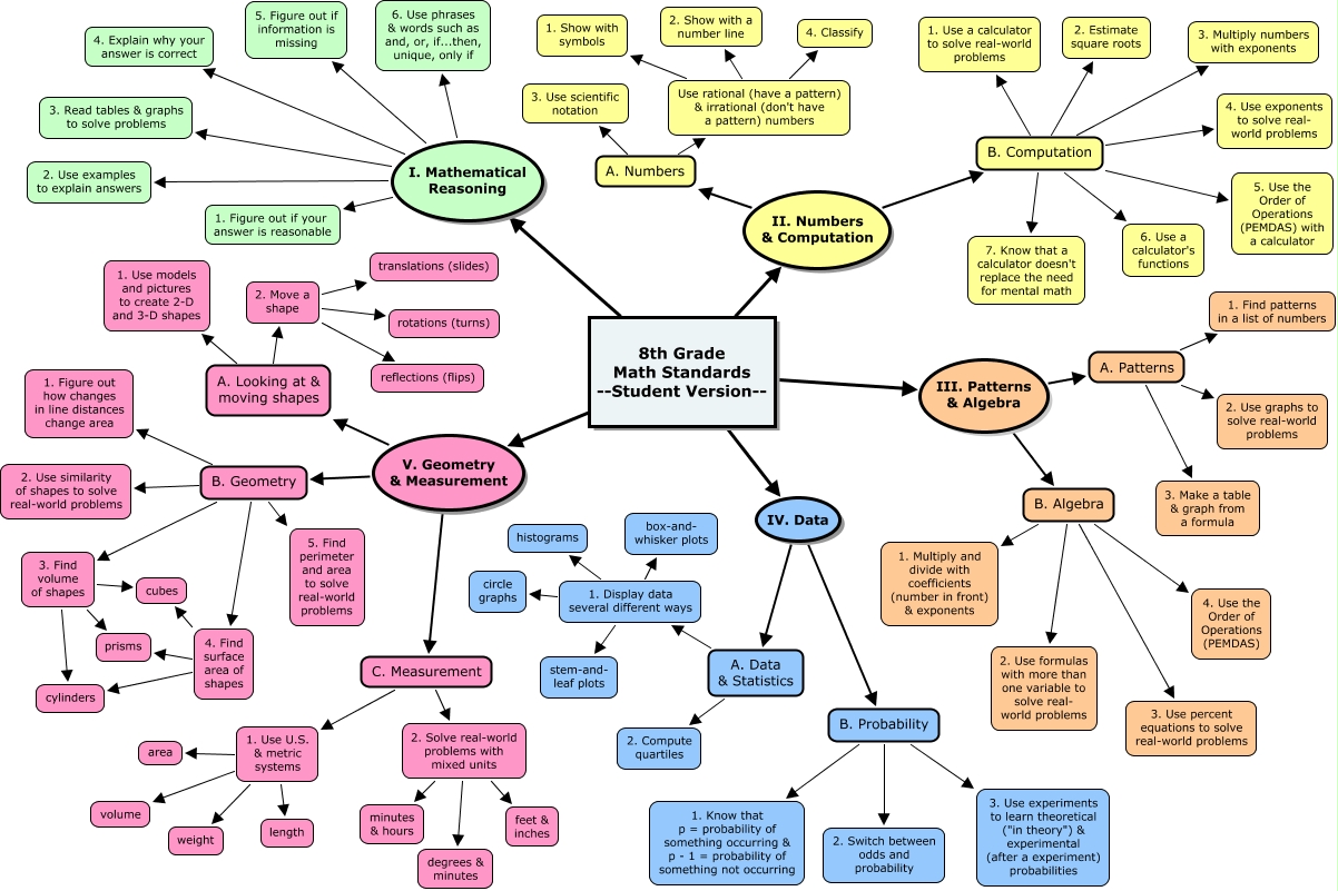 Minnesota 8th Grade Math Standards - Kid Friendly Version, 2. Solve real-world problems with mixed units feet & inches, 1. Display data several different ways circle graphs, I. Mathematical Reasoning 6. Use phrases & words such as and, or, if...then, unique, only if, B. Algebra 1. Multiply and divide with coefficients (number in front) & exponents, A. Looking at & moving shapes 1. Use models and pictures to create 2-D and 3-D shapes, A. Patterns 1. Find patterns in a list of numbers, III. Patterns & Algebra B. Algebra, Use rational (have a pattern) & irrational (don't have a pattern) numbers 2. Show with a number line, B. Computation 7. Know that a calculator doesn't replace the need for mental math, A. Patterns 3. Make a table & graph from a formula