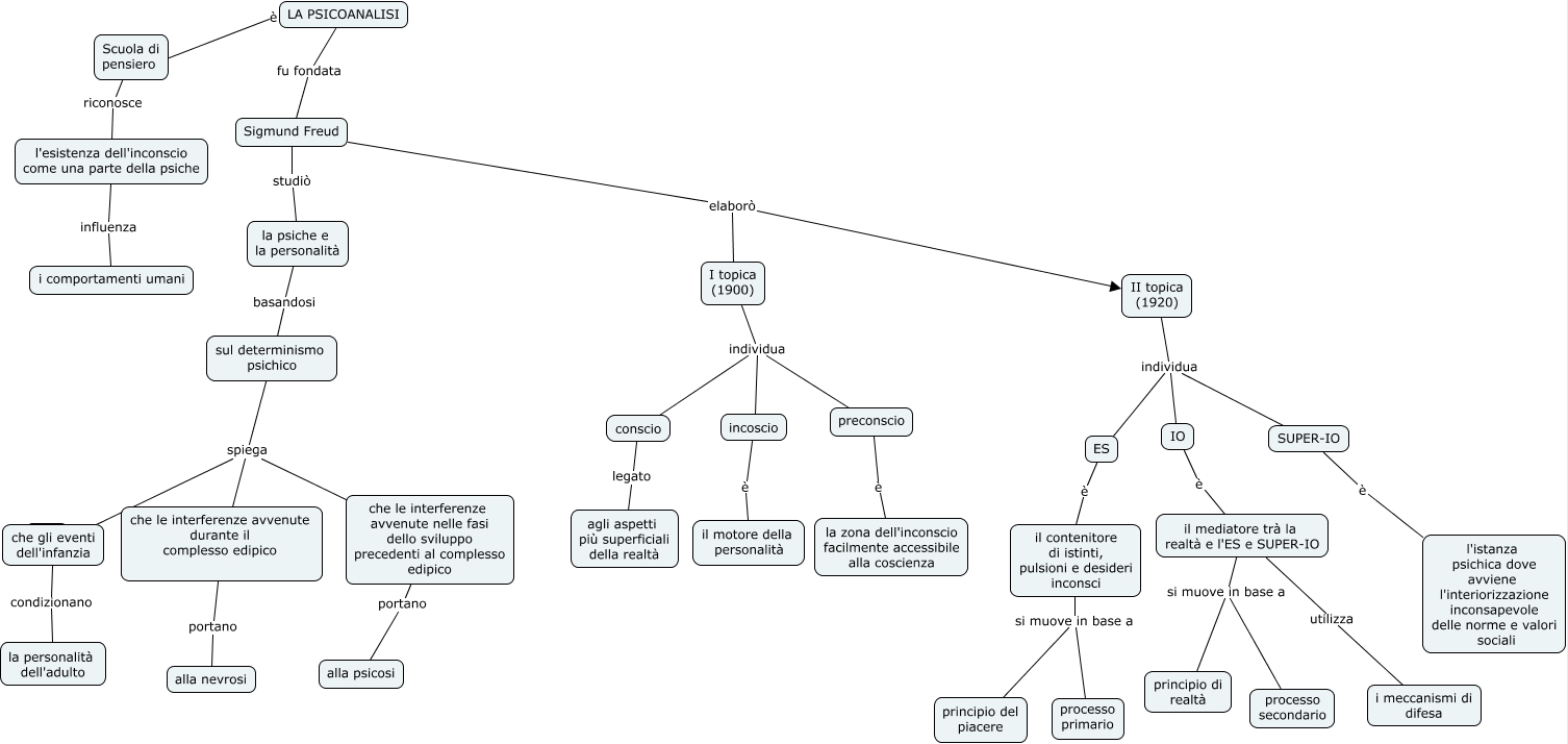 Questa Cmap, creata con IHMC CmapTools, contiene informazioni relative a: Psicoanalisi 1, Sigmund Freud elaborò I topica (1900), il mediatore trà la realtà e l'ES e SUPER-IO si muove in base a principio di realtà, SUPER-IO è l'istanza psichica dove avviene l'interiorizzazione inconsapevole delle norme e valori sociali, che le interferenze avvenute durante il complesso edipico portano alla nevrosi, II topica (1920) individua ES, Scuola di pensiero riconosce l'esistenza dell'inconscio come una parte della psiche, la psiche e la personalità basandosi sul determinismo psichico, sul determinismo psichico spiega che le interferenze avvenute nelle fasi dello sviluppo precedenti al complesso edipico, I topica (1900) individua incoscio, I topica (1900) individua conscio, il mediatore trà la realtà e l'ES e SUPER-IO utilizza i meccanismi di difesa, ES è il contenitore di istinti, pulsioni e desideri inconsci, sul determinismo psichico spiega che gli eventi dell'infanzia, LA PSICOANALISI è Scuola di pensiero, che gli eventi dell'infanzia condizionano la personalità dell'adulto, LA PSICOANALISI fu fondata Sigmund Freud, sul determinismo psichico spiega che le interferenze avvenute durante il complesso edipico, che le interferenze avvenute nelle fasi dello sviluppo precedenti al complesso edipico portano alla psicosi, il mediatore trà la realtà e l'ES e SUPER-IO si muove in base a processo secondario, l'esistenza dell'inconscio come una parte della psiche influenza i comportamenti umani