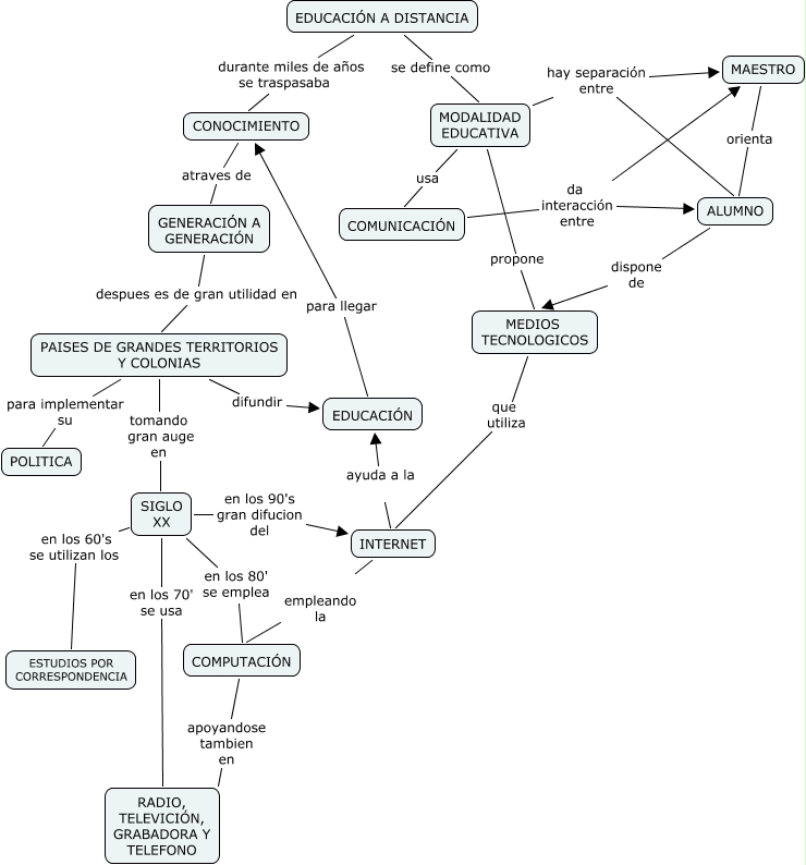 Este Cmap, tiene información relacionada con: Educ Distancia, PAISES DE GRANDES TERRITORIOS Y COLONIAS tomando gran auge en SIGLO XX, MODALIDAD EDUCATIVA hay separación entre MAESTRO, COMUNICACIÓN da interacción entre MAESTRO, MODALIDAD EDUCATIVA hay separación entre ALUMNO, EDUCACIÓN A DISTANCIA durante miles de años se traspasaba CONOCIMIENTO, SIGLO XX en los 70' se usa RADIO, TELEVICIÓN, GRABADORA Y TELEFONO, INTERNET ayuda a la EDUCACIÓN, COMPUTACIÓN apoyandose tambien en RADIO, TELEVICIÓN, GRABADORA Y TELEFONO, EDUCACIÓN A DISTANCIA se define como MODALIDAD EDUCATIVA, SIGLO XX en los 90's gran difucion del INTERNET, SIGLO XX en los 80' se emplea COMPUTACIÓN, MODALIDAD EDUCATIVA propone MEDIOS TECNOLOGICOS, MEDIOS TECNOLOGICOS que utiliza INTERNET, EDUCACIÓN para llegar CONOCIMIENTO, INTERNET empleando la COMPUTACIÓN, CONOCIMIENTO atraves de GENERACIÓN A GENERACIÓN, COMUNICACIÓN da interacción entre ALUMNO, GENERACIÓN A GENERACIÓN despues es de gran utilidad en PAISES DE GRANDES TERRITORIOS Y COLONIAS, PAISES DE GRANDES TERRITORIOS Y COLONIAS para implementar su POLITICA, PAISES DE GRANDES TERRITORIOS Y COLONIAS difundir EDUCACIÓN