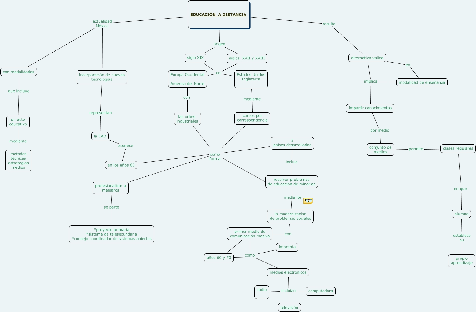 Este Cmap, tiene información relacionada con: Educ a distancia, cursos por correspondencia como forma resolver problemas de educación de minorias, incorporación de nuevas tecnologias representan la EAD, medios electronicos incluian computadora, clases regulares en que alumno, profesionalizar a maestros se parte *proyecto primaria *sistema de telesecundaria *consejo coordinador de sistemas abiertos, cursos por correspondencia como forma a paises desarrollados, primer medio de comunicación masiva ???? años 60 y 70, siglo XIX en Estados Unidos Inglaterra, EDUCACIÓN A DISTANCIA origen siglos XVII y XVIII, las urbes industriales como forma a paises desarrollados, EDUCACIÓN A DISTANCIA actualidad México con modalidades, EDUCACIÓN A DISTANCIA origen siglo XIX, Estados Unidos Inglaterra mediante cursos por correspondencia, un acto educativo mediante metodos técnicas estrategias medios, EDUCACIÓN A DISTANCIA actualidad México incorporación de nuevas tecnologias, la modernizacion de problemas sociales con primer medio de comunicación masiva, alternativa valida implica impartir conocimientos, siglos XVII y XVIII en Estados Unidos Inglaterra, alumno establece su propio aprendizaje, medios electronicos incluian televisión