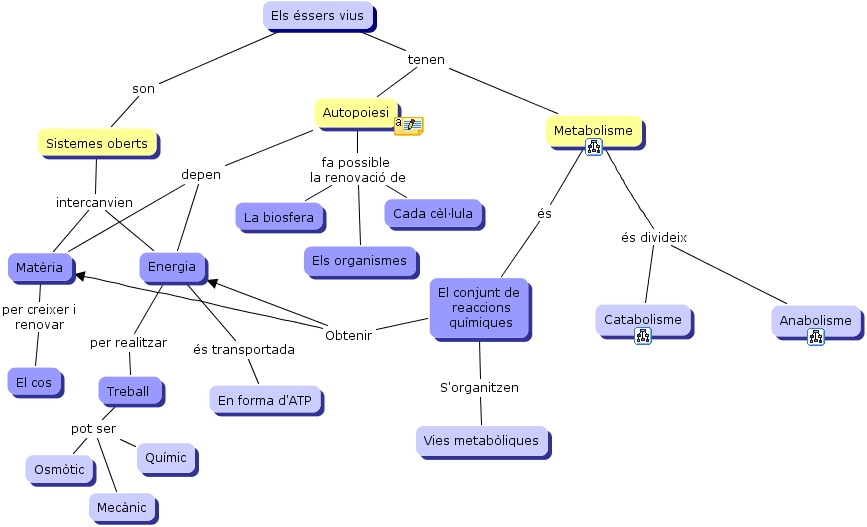 Organismes autòtrofs, Treball pot ser Químic, Els éssers vius son Sistemes oberts, Autopoiesi fa possible la renovació de La biosfera, El conjunt de reaccions químiques Obtenir Matèria, Autopoiesi depen Energia, Metabolisme és El conjunt de reaccions químiques, Sistemes oberts intercanvien Matèria, Metabolisme és divideix Anabolisme, Treball pot ser Mecànic, Treball pot ser Osmòtic