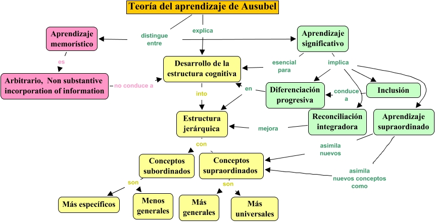 Teoría de Ausubel, Aprendizaje significativo implica Diferenciación progresiva, Estructura jerárquica con Conceptos supraordinados, Diferenciación progresiva en Desarrollo de la estructura cognitiva, Conceptos supraordinados son Más generales, Teoría del aprendizaje de Ausubel explica Desarrollo de la estructura cognitiva, Teoría del aprendizaje de Ausubel distingue entre Aprendizaje significativo, Inclusión conduce a Diferenciación progresiva, Estructura jerárquica con Conceptos subordinados, Aprendizaje significativo implica Inclusión, Arbitrario, Non substantive incorporation of information no conduce a Desarrollo de la estructura cognitiva