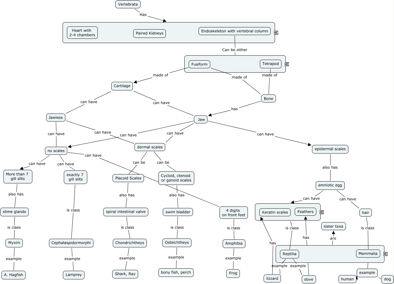 Shelli Moreda Ex 4C-Vertebrate Phyl, 4 digits on front feet is class Amphibia, Cartilage can have Jaw, spiral intestinal valve is class Chondrichtheys, dermal scales can be Placoid Scales, Chondrichtheys example Shark, Ray, Fusiform made of Bone, More than 7 gill slits also has slime glands, Bone has Jaw, Reptilia example dove, no scales can have exactly 7 gill slits
