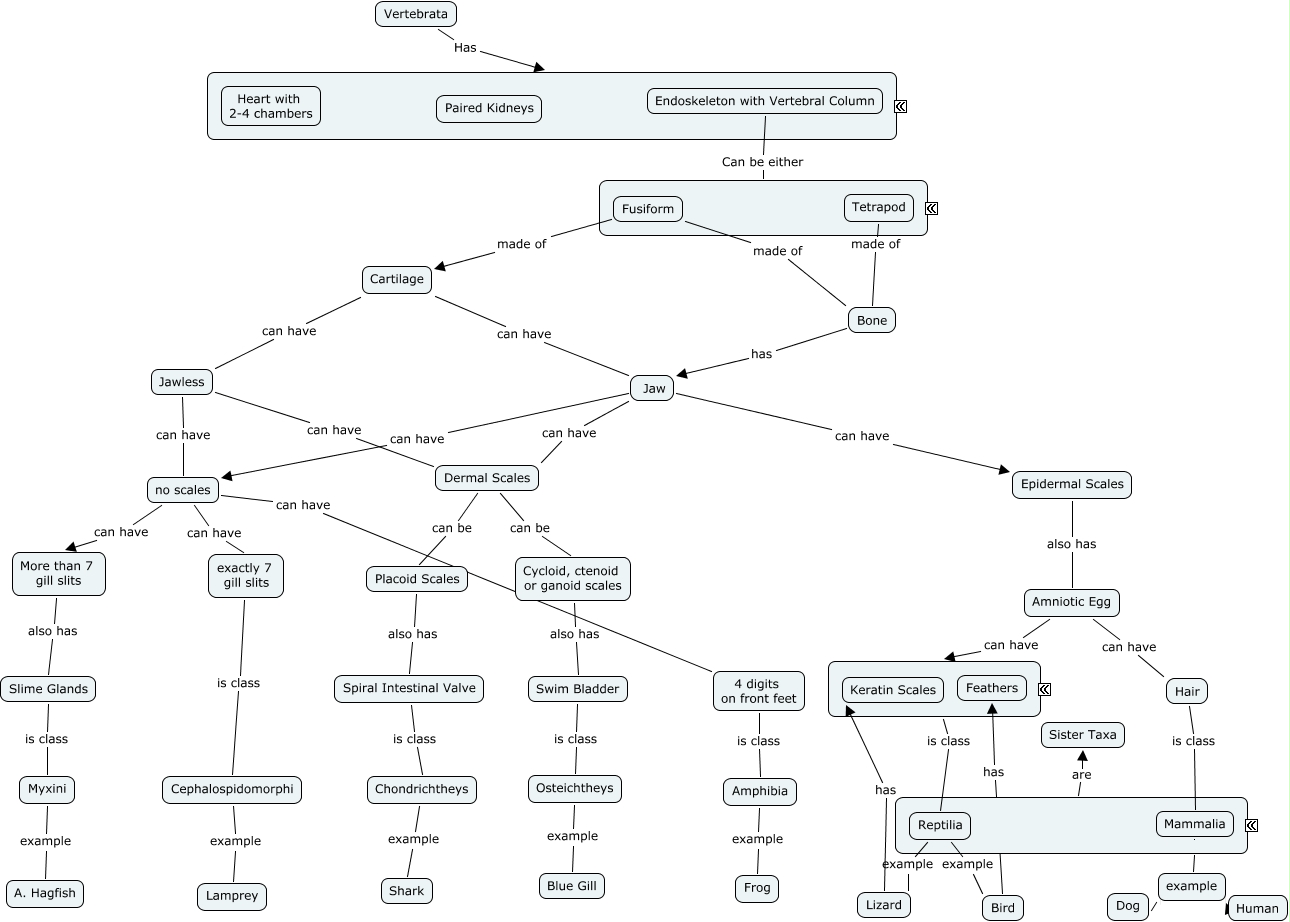 Nichole Brown 4C, Cartilage can have Jaw, 4 digits on front feet is class Amphibia, Dermal Scales can be Placoid Scales, Spiral Intestinal Valve is class Chondrichtheys, Chondrichtheys example Shark, Reptilia example Bird, Bone has Jaw, More than 7 gill slits also has Slime Glands, Fusiform made of Bone, no scales can have exactly 7 gill slits