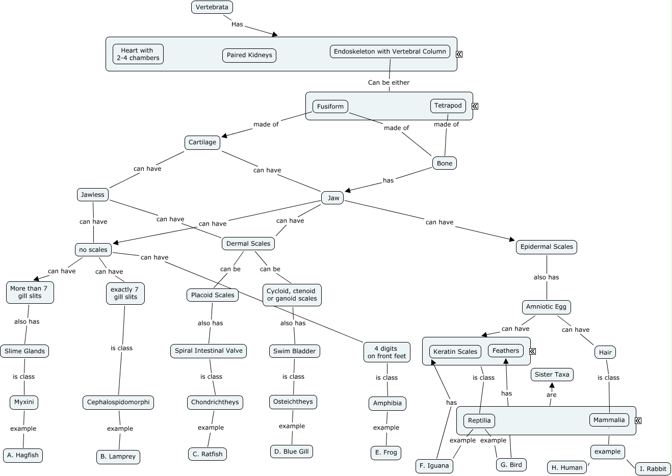 Sabrina Lam Ex 4C-Vertebrate Phyl, 4 digits on front feet is class Amphibia, Cartilage can have Jaw, Spiral Intestinal Valve is class Chondrichtheys, Dermal Scales can be Placoid Scales, Chondrichtheys example C. Ratfish, Fusiform made of Bone, More than 7 gill slits also has Slime Glands, Bone has Jaw, Reptilia example G. Bird, no scales can have exactly 7 gill slits