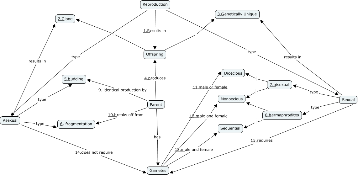 Chelsea Marshall Ex 4D-Reproduction, Gametes 13.male and female Sequential, Reproduction 1.Results in Offspring, Reproduction type Asexual, Parent has Gametes, Gametes 12.male and female Monoecious, Asexual type 6. fragmentation, Gametes 11.male or female Dioecious, Sexual results in 3.Genetically Unique, Parent 10.breaks off from 6. fragmentation, 7.bisexual Dioecious