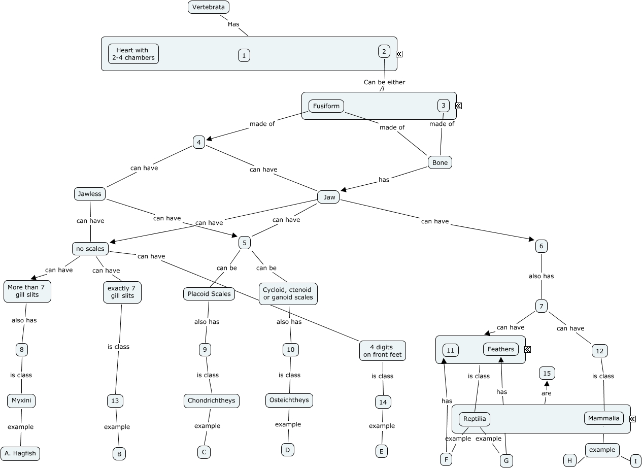 Ex 4C-Vertebrate Phyl, 4 can have Jaw, 4 digits on front feet is class 14, 5 can be Placoid Scales, 9 is class Chondrichtheys, Chondrichtheys example C, Reptilia example G, Bone has Jaw, More than 7 gill slits also has 8, Fusiform made of Bone, no scales can have exactly 7 gill slits