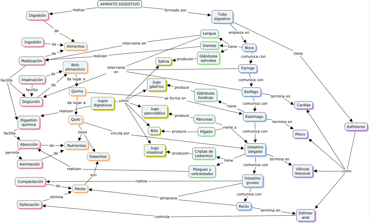 Este Cmap, tiene información relacionada con: Digestivo 3, Insalivación facilita Deglución, Esfínteres como Cardias, Estómago termina en Píloro, Quilo tiene Desechos, Esfínteres como Válvula ileocecal, Pliegues y vellosidades realizan Absorción, Páncreas vierte a Intestino delgado, Esófago comunica con Estómago, Defecación elimina Heces, Criptas de Lieberkün producen Jugo intestinal, Masticación facilita Digestión química, Masticación de Alimentos, Quilo tiene Nutrientes, APARATO DIGESTIVO formado por Tubo digestivo, Glándulas fúndicas produce Jugo gástrico, Hígado vierte a Intestino delgado, Hígado produce Bilis, Jugos digestivos realizan Digestión química, Ingestión de Alimentos, Esfinter anal controla Defecación